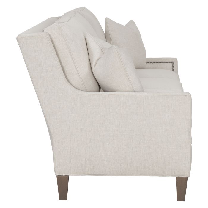Product Description: Fairfield 2996-50 Kelly Sofa with Tapered Leg - Kelly is an upholstery series with four cushion configurations available with boxed back or knife-edge back cushions and your choice of skirt or tapered leg with finish options. Kelly frames are standard with small nail head trim, available in multiple finish options around the inside arm of the sofas and chairs.