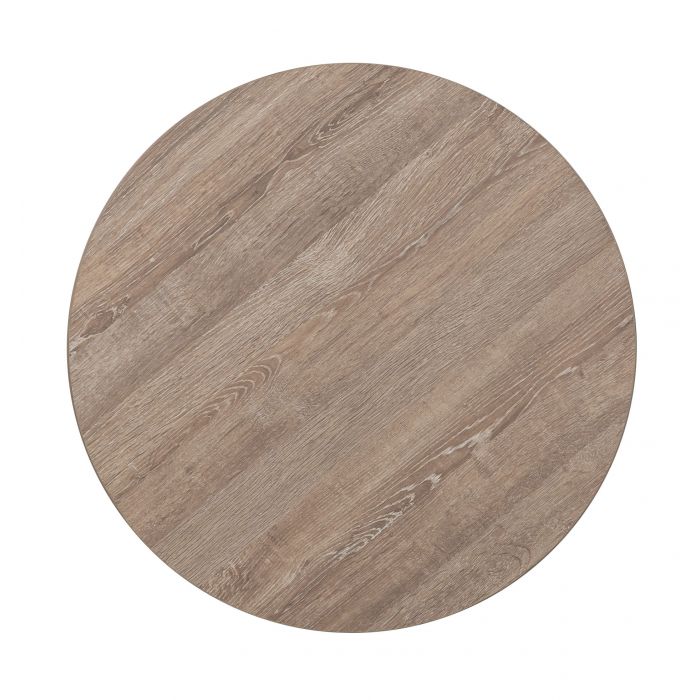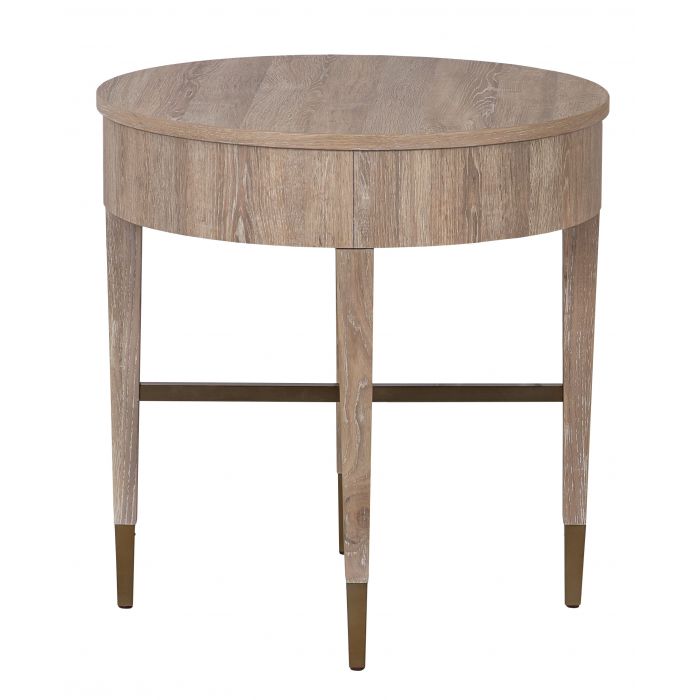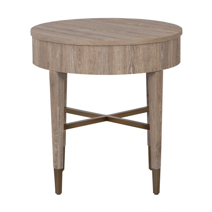 Product Description: Fairfield 4159-19 La Jolla Round End Table - La Jolla blends the style and functionality of high-level design with the performance and commercial-grade durability of laminate. The collection features occasional pieces in transitional silhouettes with antique brass details and finished in both Scrubbed and Fumed Oak.