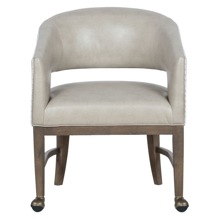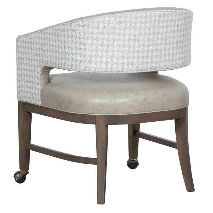 Product Description: Fairfield 8864-A2 Cleo Grande Arm Chair with two front casters - The Cleo Grande barrel back dining chair with an open back and wood base is a stylish and comfortable seating option for your dining area. Features a curved barrel-shaped backrest that provides excellent support and comfort. The chair is supported by a sturdy wooden base, which adds a touch of elegance and durability to the design. It is a great addition to any dining space, providing both style and comfort.