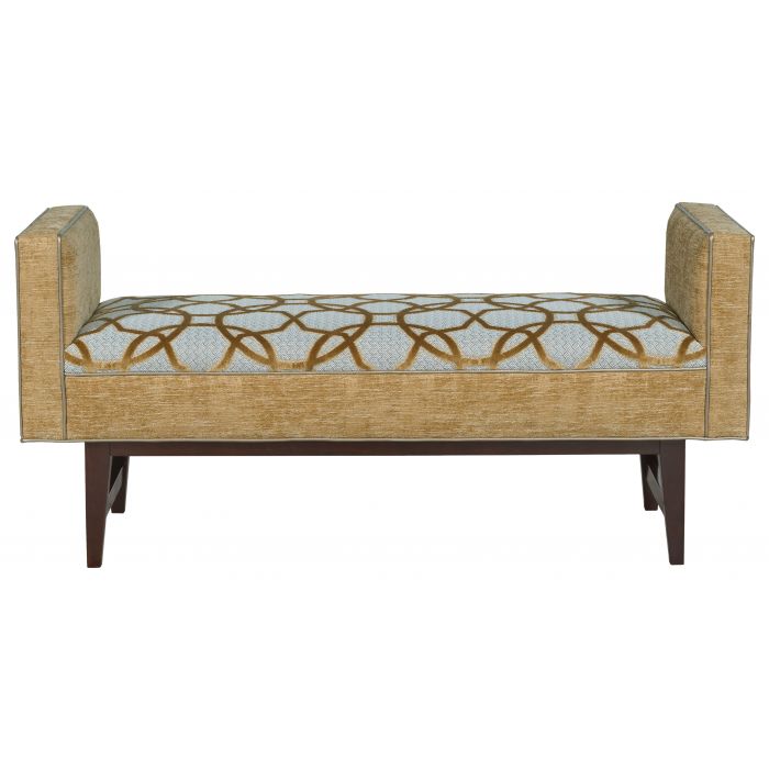Product Description: Fairfield L-1603-10 Luna Bench - This bench has contemporary styling. The tight seat is framed by a welted border. The ends feature raised arms with angular shaping. The exposed wood base has tapered legs with stretchers.
