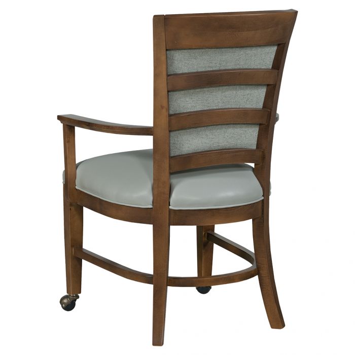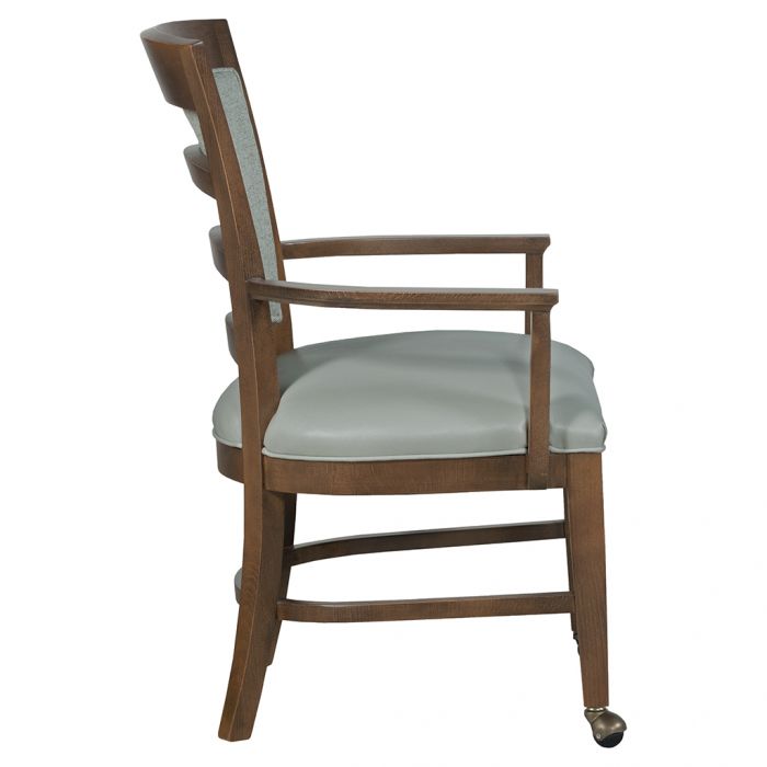 Product Description: Fairfield L-8365-A2 Jefferson Arm Chair - This transitional chair has an upholstered seat and back. The outside back has exposed wood ladder back detailing. The open arms follow the contour of the seat shape. The legs are tapered and have a curved stretcher. The legs have casters.