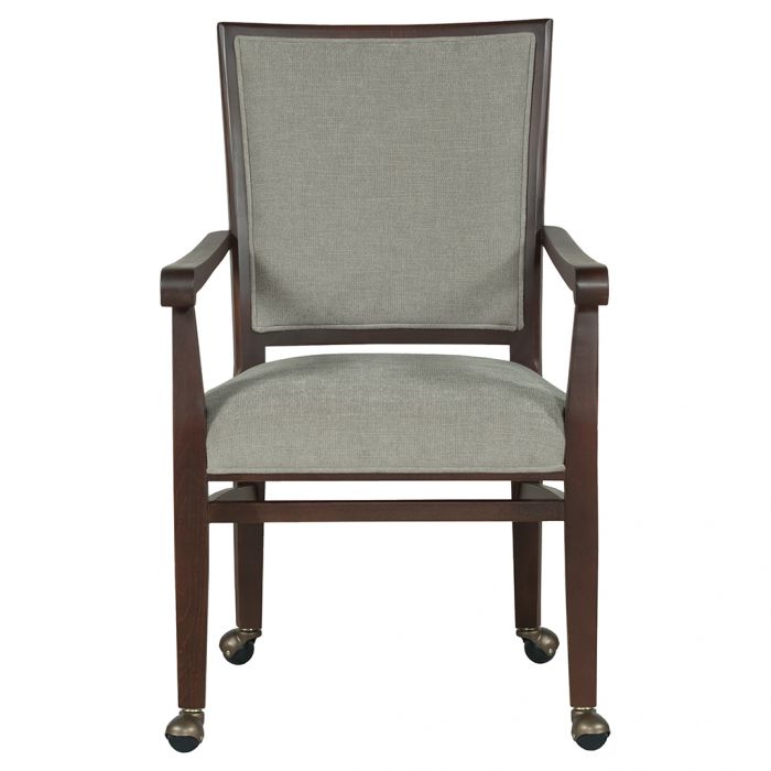 Product Description: Fairfield L-8411-A4 Plymouth Arm Chair - This arm chair has a comfortable upholstered seat and back. Exposed wood borders the back. The open arms have rounded fronts. The tapered legs have stretchers. Casters are on the legs.