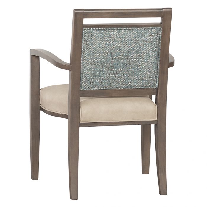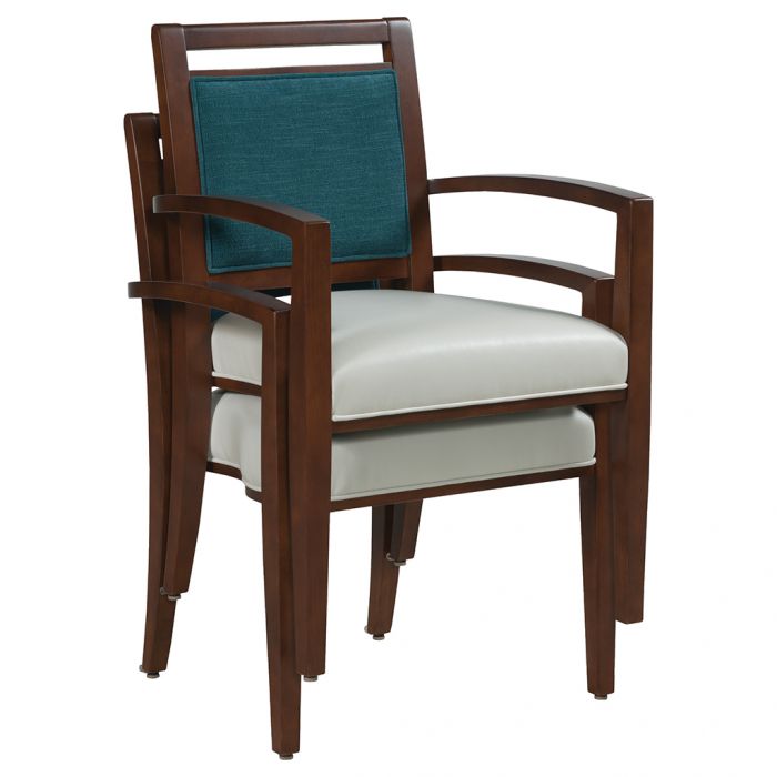 Product Description: Fairfield L-8700-11 Preston Arm Stack Chair - This arm chair has an upholstered seat and back. Exposed wood frames the back and features an open rail at the top. The open arms arch slightly and flow down to the legs. The seat is contoured and engineered to allow for this chair to be stacked up to 3 high.
