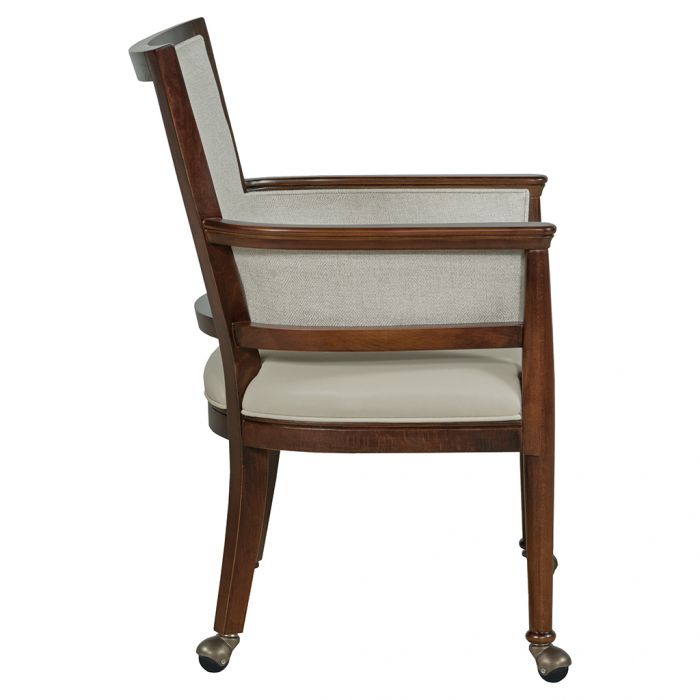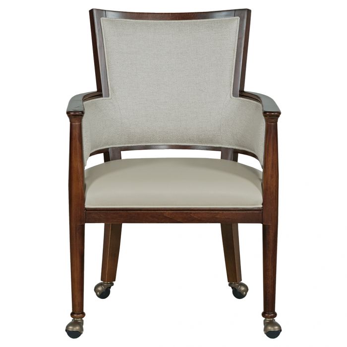 Product Description: Fairfield L-8727-A4 Murphy Arm Chair - This arm chair has traditional styling. Exposed wood trim frames the back and arms. The arms curve from the back and follow the contour of the seat. The rounded legs have banding detail. The legs have casters.