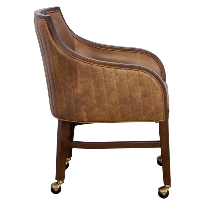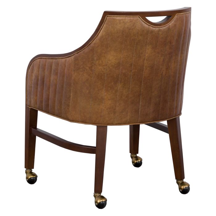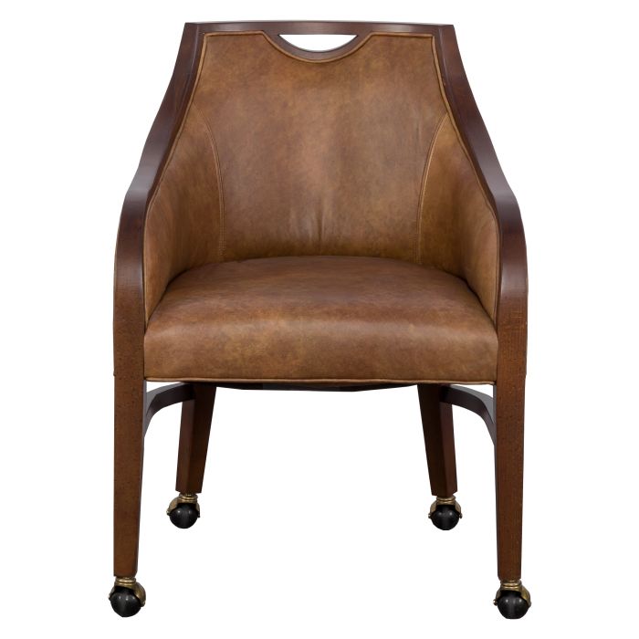 Product Description: Fairfield L-8740-A4 Anthony Arm Chair - This transitional arm chair has exposed wood framing the back and flowing down the fronts of the arms. A notched opening at the top back edge provides a convenient holding spot. The wood legs have stretchers and casters.