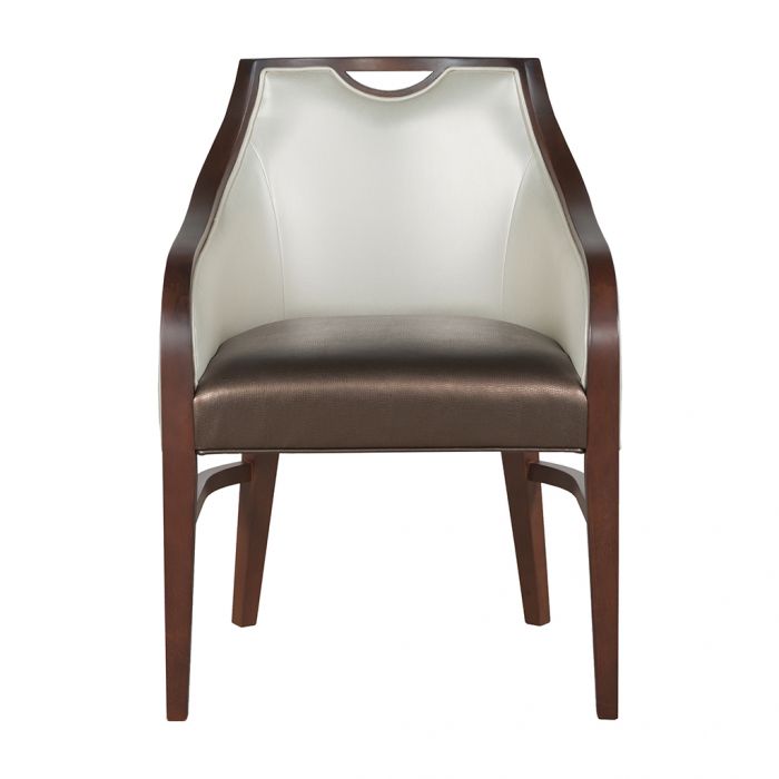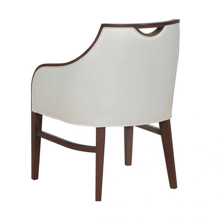 Product Description: Fairfield L-8741-04 Anthony Arm Chair - This transitional arm chair has exposed wood framing the back and flowing down the fronts of the arms. A notched opening at the top back edge provides a convenient holding spot. The wood legs have stretchers and casters.