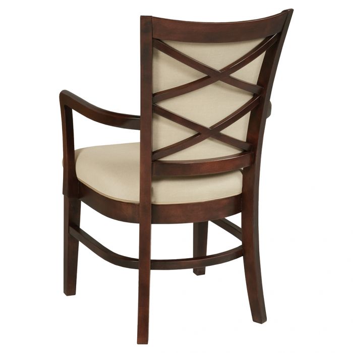 Product Description: Fairfield L-8770-04 Laughlin Arm Chair - This arm chair has transitional styling. Exposed wood frames the back and seat. The open arms are shaped to follow the contour of the seat. The outside back has x shaped lattice detail. The legs have curved stretchers.