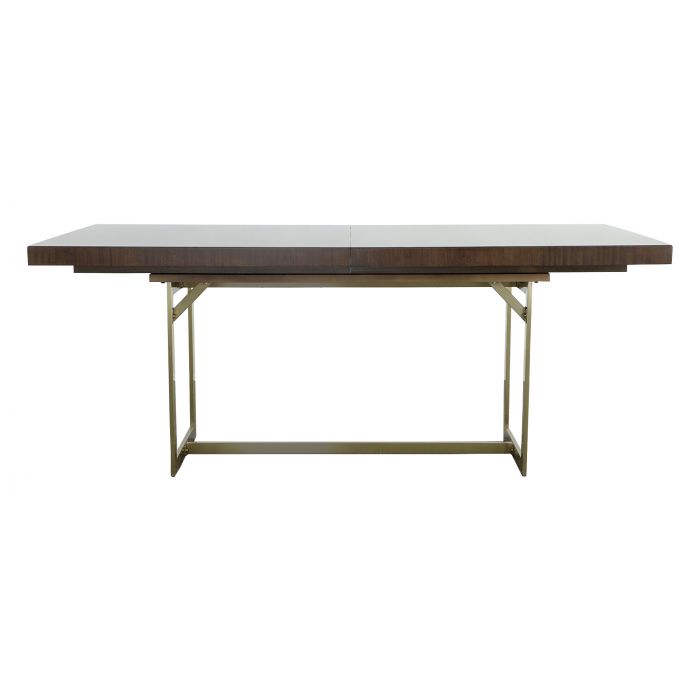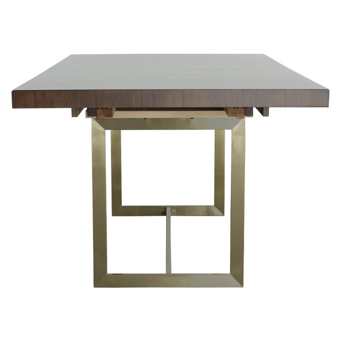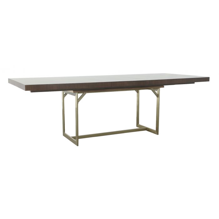 Product Description: Fairfield M317-DT Libby Langdon Clement Dining Table - The Clement Dining Table is all about simple style with major impact, it features a Champagne metal brass finish base to add a polished touch to the design. The top is Eucalyptus Veneers in Smoked Stone finish to help highlight the grain detail for visual interest which is equally sleek and stylish. With the leaves removed at 76" wide the Clement dining table would also work beautifully as an oversized writing desk, it's sure to fit right in with minimalist, Scandinavian, or even modern farmhouse-styled spaces. As a dining table it can seat several people, and the design easily accommodates either chairs or dining benches!