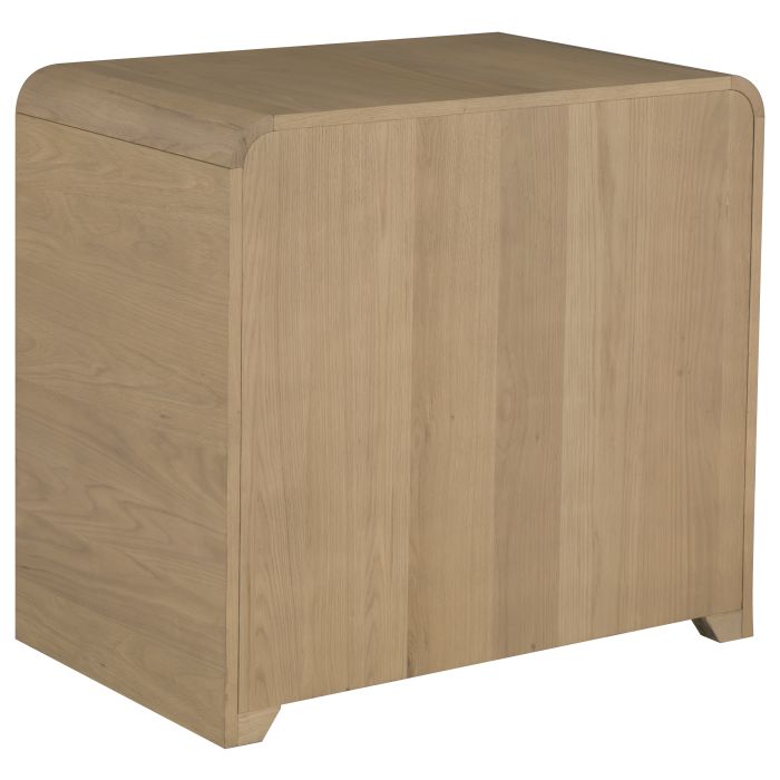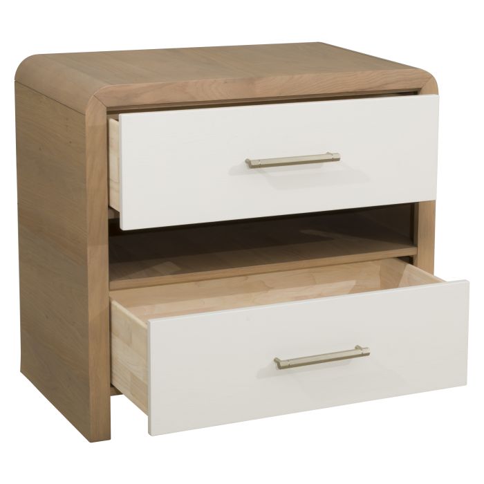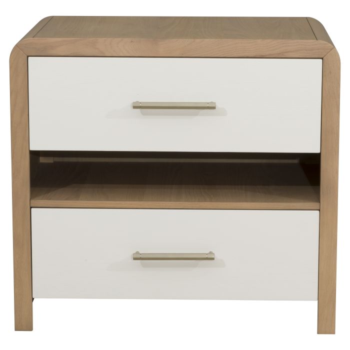 Product Description: Fairfield M306-BS Libby Langdon Brentwood Two Drawer Nightstand - The Brentwood nightstand is all about combining finishes to create a stylish look for a dynamic design. This well-proportioned piece feels substantial and with the upper curved lines there is still a softness and an ease to the overall feel. The champagne brass hardware is the perfect highlight on the creamy latte drawer faces and the natural finish on the outer wood frame creates contrast that makes the Brentwood nightstand so versatile.