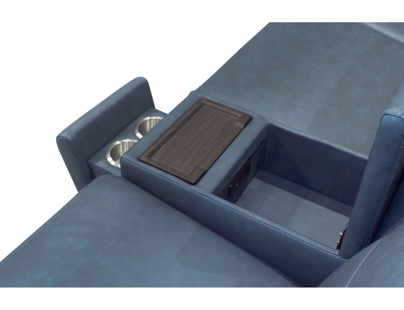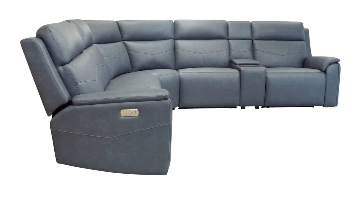 Product Description: Flexsteel 1592-SECTP5-38640 Vernon Admiral Fabric Power Reclining Sectional with Power Headrest, Lumbar, Heat, & Massage - A versatile showstopper, the Vernon power reclining sectional has everything you need for ultimate comfort. Its sleek, modernized silhouette is upholstered in a family-friendly, leather-like fabric with CloudLux™ down alternative seat toppers and headrests that will put you on cloud nine. Customizable Zero Gravity recline, and adjustable heat and massage bring the best in relaxation, while the center console contains storage, cupholders, and a charging tray to keep everything you need within reach. Kick back and stand out, all with Vernon.
