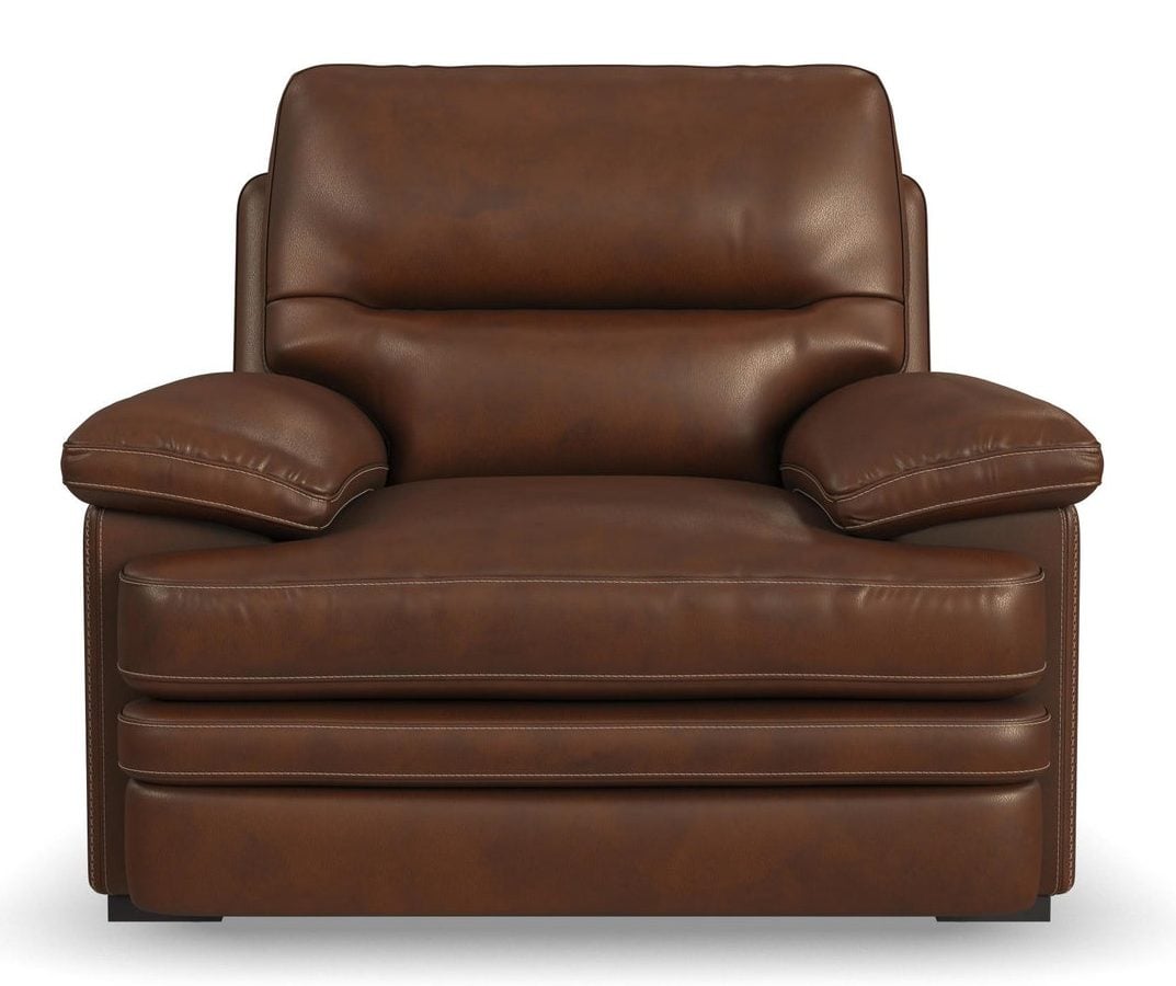 Product Description: Flexsteel 1825-10-90772 David Pecan Leather Chair - Experience ultimate comfort and unrivaled value with the David chair. Undeniably plush, sink into the wide seat cushion, divided back and lofty pillow-padded arms. The grand scale and sophisticated silhouette features a unique layered front rail and striking stitch details. Upholstered in a buttery-soft, protected top-grain leather, this chair can be paired with the matching ottoman and is designed for everyday enjoyment and active lifestyles.