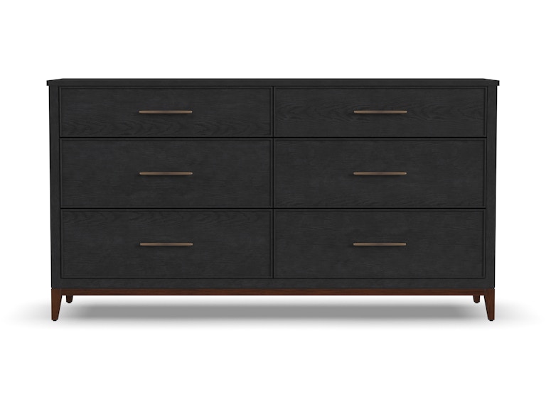Product Description: Flexsteel W1027-860 Waterfall Dresser - Architectural Appeal. Add effortless style and architectural appeal to your bedroom with the Waterfall dresser. This spacious dresser features a timeless silhouette defined by clean lines and simple geometric shapes. Antiqued copper-finish hardware and a dark brown base add a striking accent to the deep ebony finish. Ample storage for clothing and other essentials is provided with six soft-close drawers. This dresser is expertly crafted from solid rubberwood and oak veneers, and features dovetail joinery for long-lasting durability.
