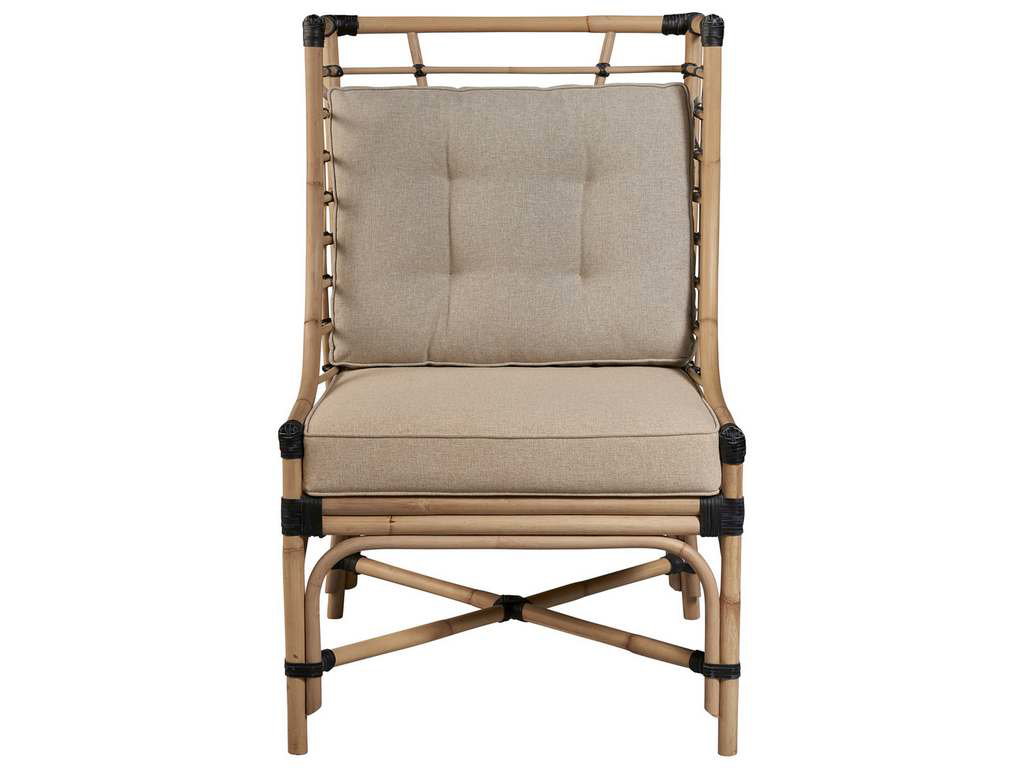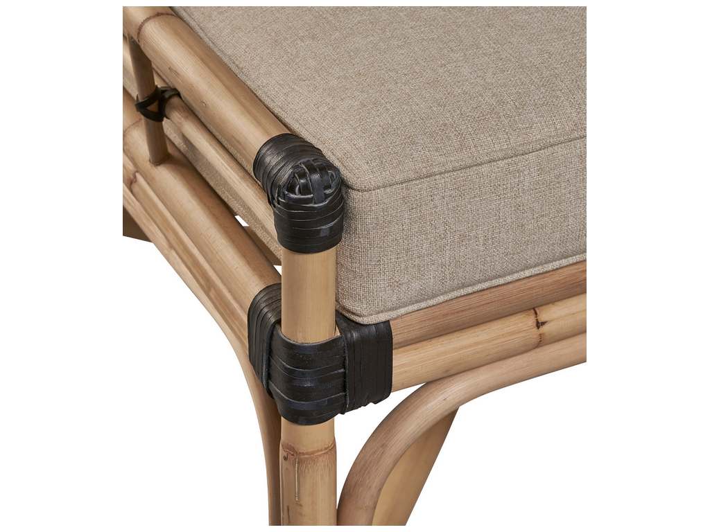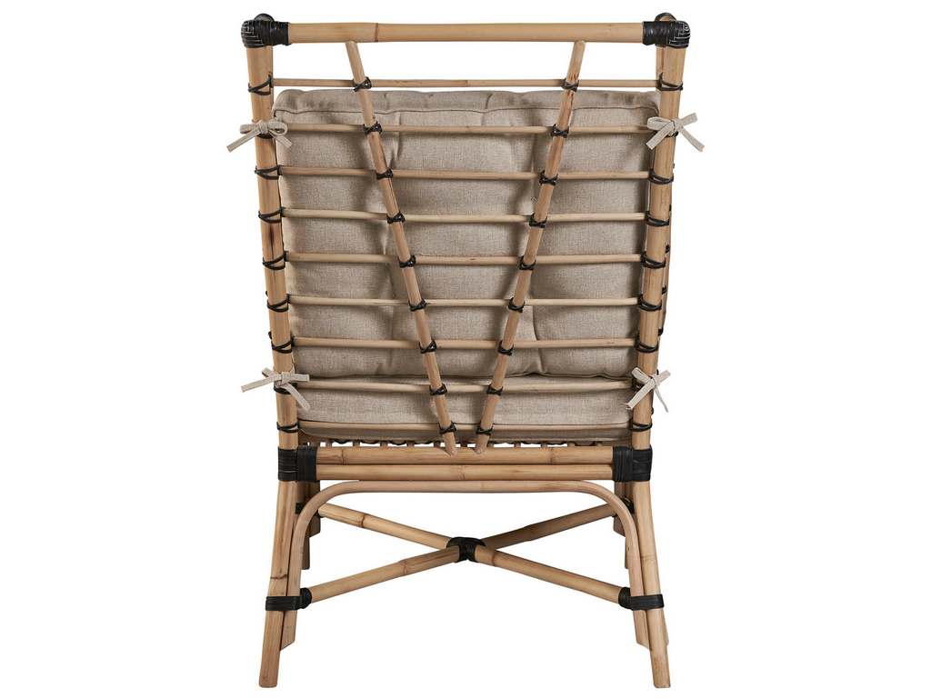 Product Description: Furniture Classics 18-70 Golden Days Rattan Chair with Leather Bindings - The traditional wing chair form is taken to new design heights when it is translated into a stripped down frame of natural rattan with black leather bindings. The sweeping lines of the frame are created by steam bending the rattan, and allow this stunning chair to nestle up to a dining table as a host chair, while it is equally delightful as an accent in your living or sun room. The cushions are upholstered in a warm neutral fabric, and the back cushion features ties to keep it neatly in place.