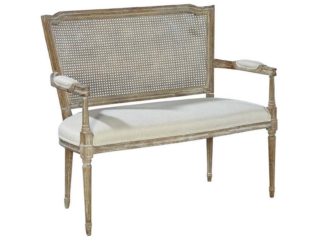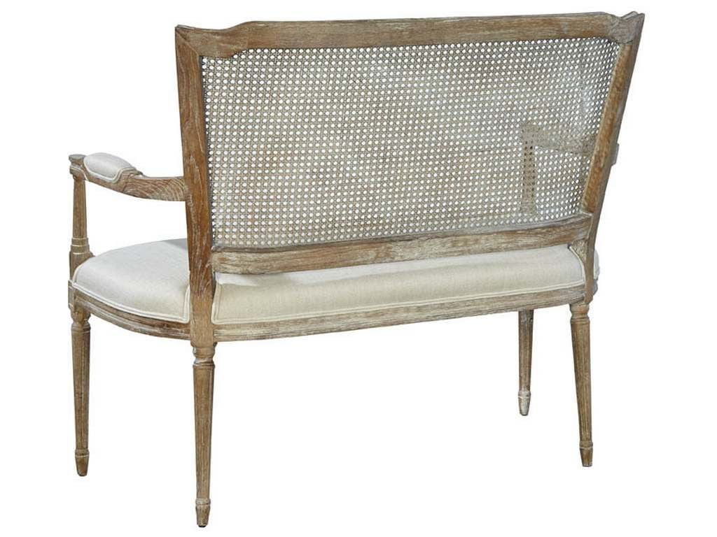 Product Description: Furniture Classics 20-040 Channing Settee - Delicately scaled, this oak beauty features a soft driftwood finish and an elegant hand-caned back. Perfect in a foyer or flanking a fireplace, this charmer is also wonderful pulled up to a dining table!