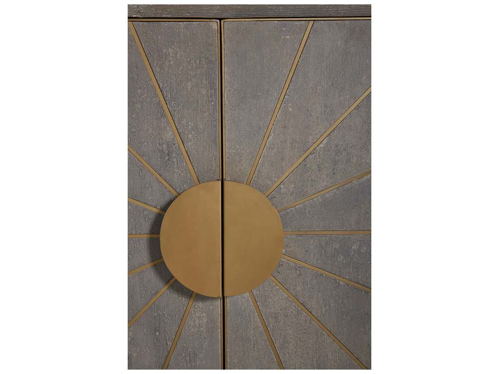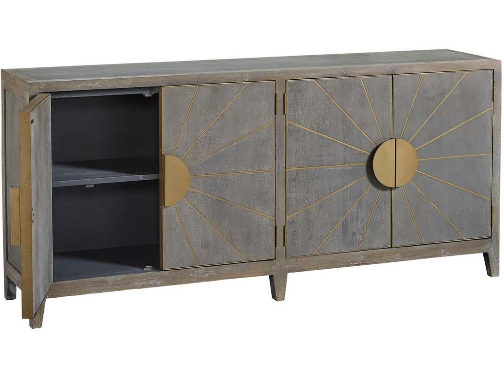 Product Description: Furniture Classics 20-285 Rising Sun Sideboard - Bring sunshine and great design into your home when you chose this beauty for your stylish interior. The cool gray finish is enhanced by the warm brass inlaid sun rays, stunning circular pulls and framing on the doors. This chest also provides ample practical storage, with a removable shelf behind each pair of doors.