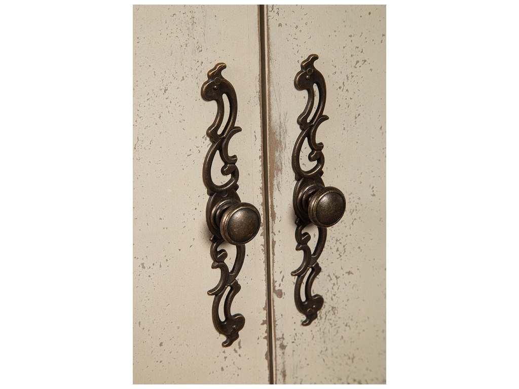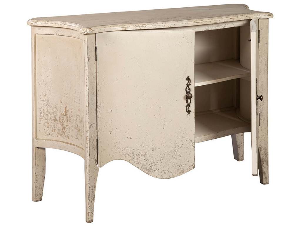 Product Description: Furniture Classics 20-469 Roth Hall Cabinet - Who says practical can't be pretty? Offering ample storage behind its show-stopping deeply scalloped doors, this cabinet features curved sides and lovely tapered legs for a touch of lightness. The pine cabinet is painted a soft dove gray on all four sides for ease of placement, and the front and sides are delicately distressed to add a sense of graceful age.
