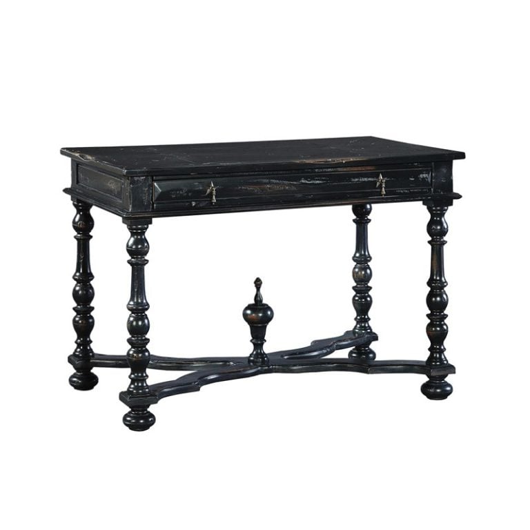 Shapely turned legs, curved stretchers, and a dramatic finial make this desk the perfect accent for any room The physically distressed black paint is rubbed through to wood creating a warm and user friendly finish The center drawer features unique star shaped drop pulls.