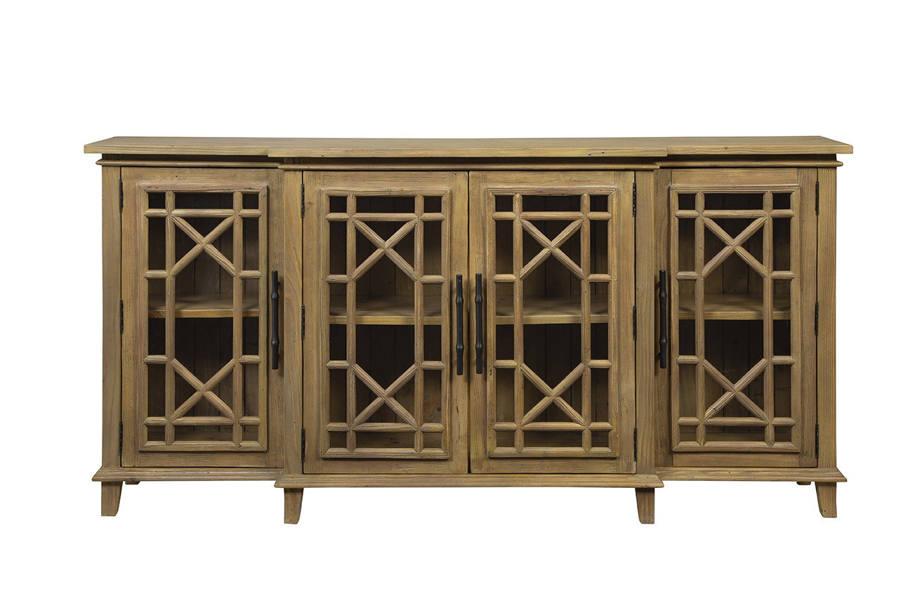 Product Description: Furniture Classics 32065AF50 Charleston Buffet - Immerse your space in sophistication with the Charleston Buffet, expertly crafted from light-colored pine wood for a touch of timeless elegance. This exquisite buffet features a center opening with double doors, flanked by additional doors on each side, providing ample storage space for your dining essentials. The glass doors are adorned with a layered geometric wood design, offering a glimpse into the beautifully panelled interior of the buffet. While simple in color, the intricate design details of the Charleston Buffet bring out its natural beauty, adding a touch of refined charm to your dining area.