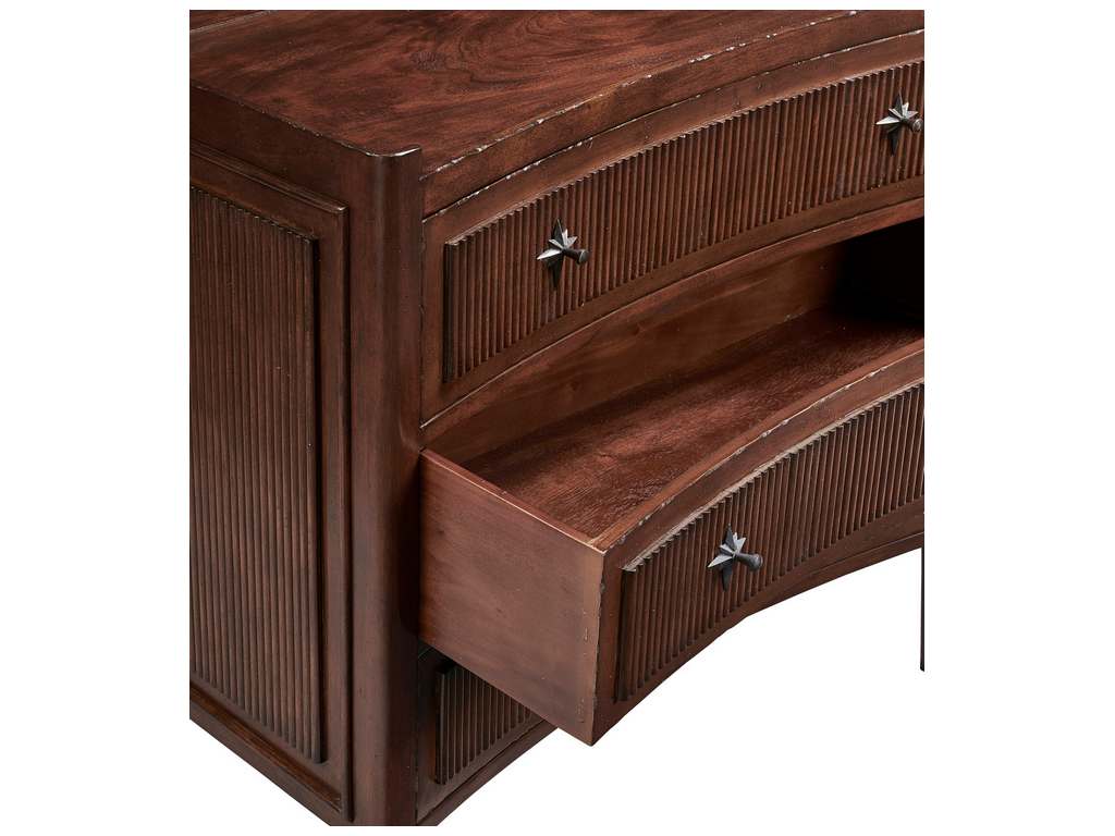 Product Description: Furniture Classics 32529AE68 Walnut Reeded Chest of Drawers - Whether placed between a pair of chairs, or used as the focal point of a small entry way, this concave charmer is sure to capture your heart. Reminiscent of tambour design, the cabinet sides and drawer fronts feature raised fluted carvings which enhance the delicate appearance of this versatile chest. Unique star shaped iron pulls add a touch of whimsy, and the gallery edge keeps the cat from pushing the remote onto the floor.