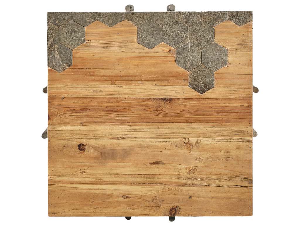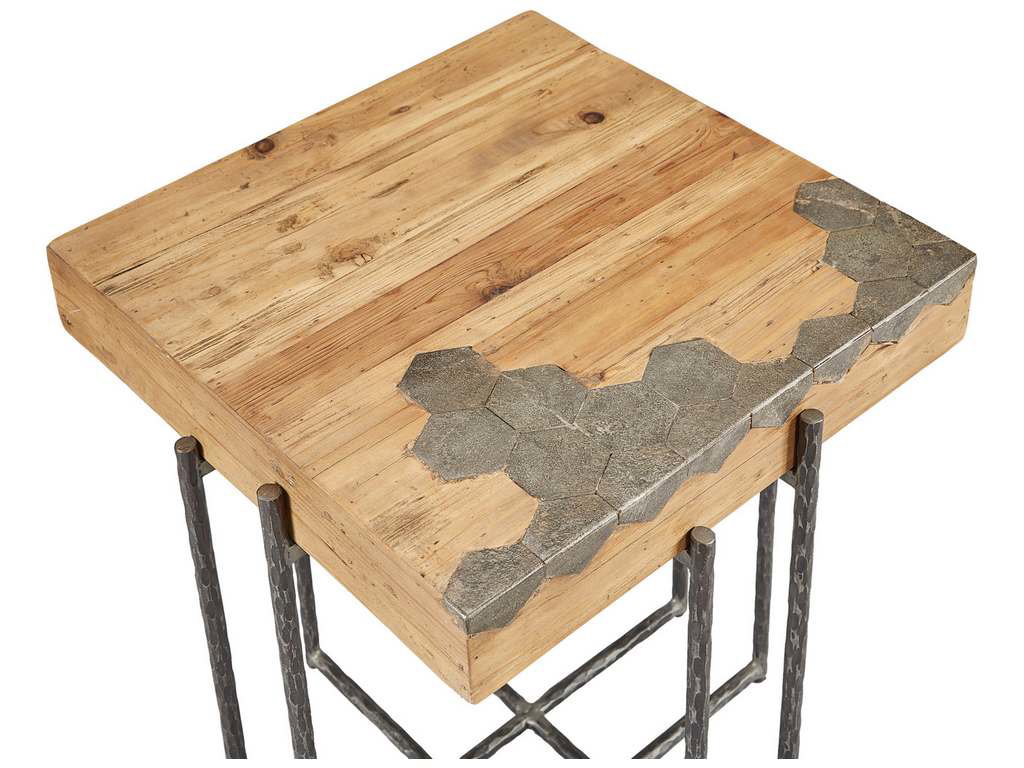 Product Description: Furniture Classics 40-132 Honeycomb End Table - Taking it's cues from the busy honey bee, this unique table features a honeycomb inlay of bluestone in the reclaimed Pine top. Iron rebar legs form the overlapping high/low base.