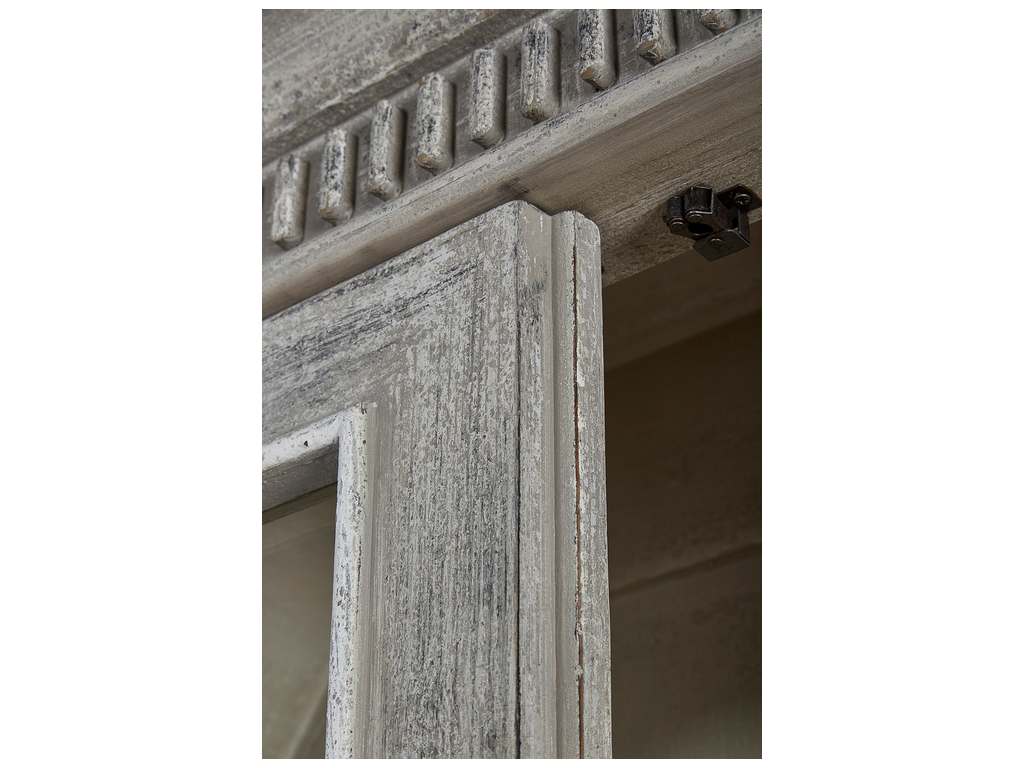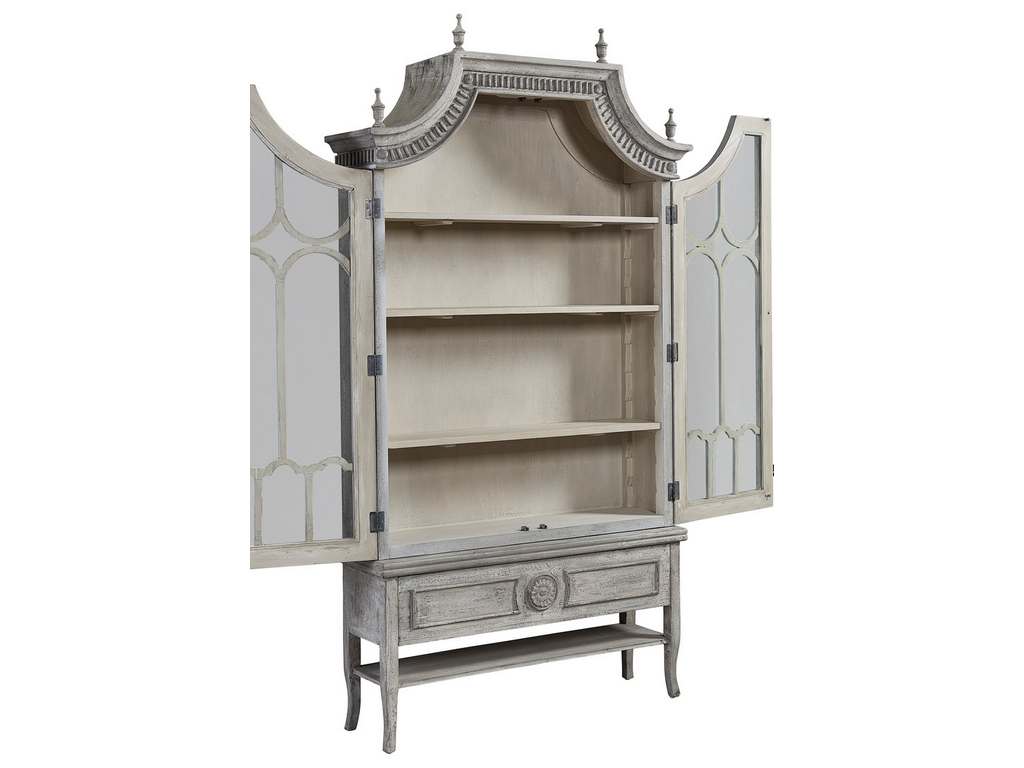 Product Description: Furniture Classics 40-87-1 Reims Cathedral Arched Cabinet - Add a feminine touch to any interior when you introduce this delicately detailed cabinet. Softly defined with a grey and white finish, this lovely cabinet is also practical. Ample display space is provided behind the unique mullioned doors, and hidden storage is offered behind the lower panel. The lower shelf is perfect for storing ironstone platters or teacups. If desired, the finials may be removed to simplify the silhouette.