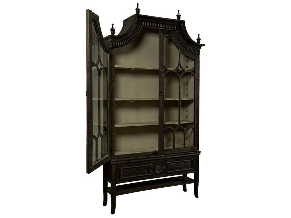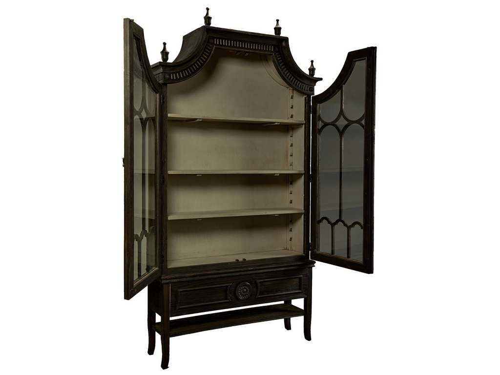 Product Description: Furniture Classics 40-87 Reims Cathedral Black Arched Cabinet - The quiet elegance of this cabinet is achieved by combining the timeless charm of mullioned details with a softly modern charcoal and brown finish. The light gray interior features fully adjustable shelves with plate grooves and there is a cunning concealed drawer behind the apron. A recessed shelf is tucked between the legs, providing a perfect place for a favorite platter or your favorite bowls. Turned finials adorn the pagoda top, but may be removed for a sleeker appearance.