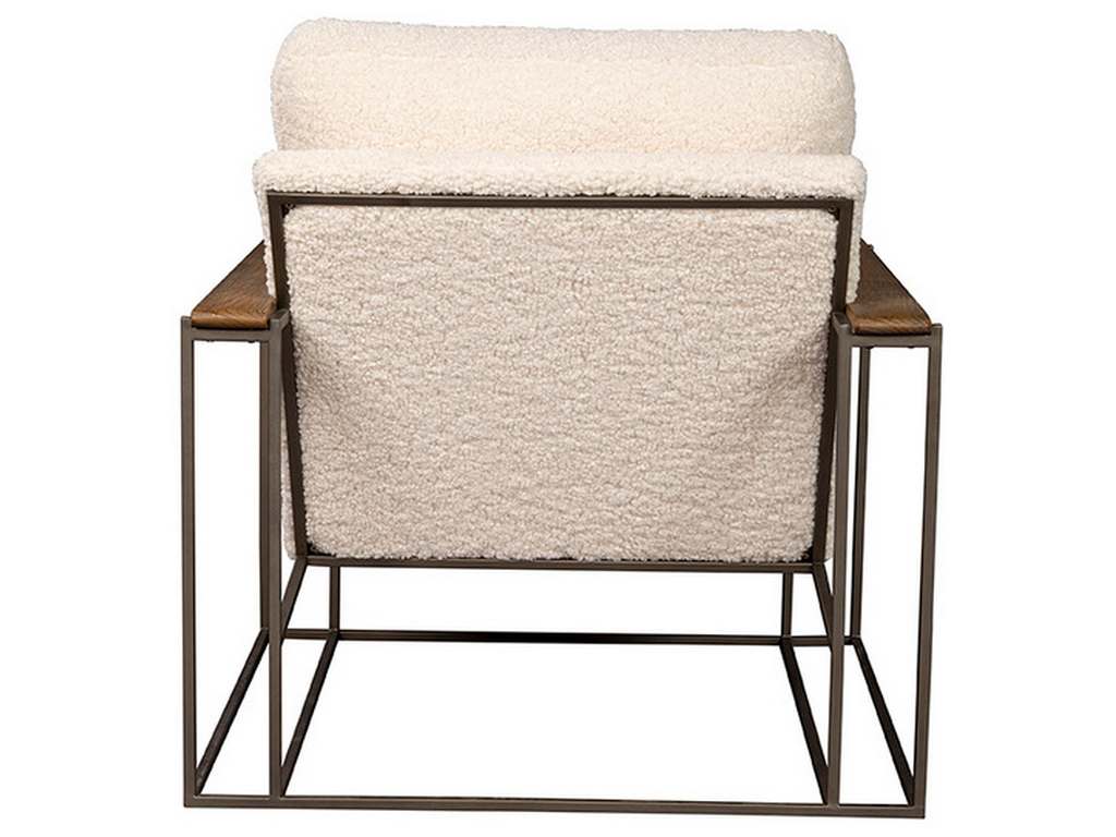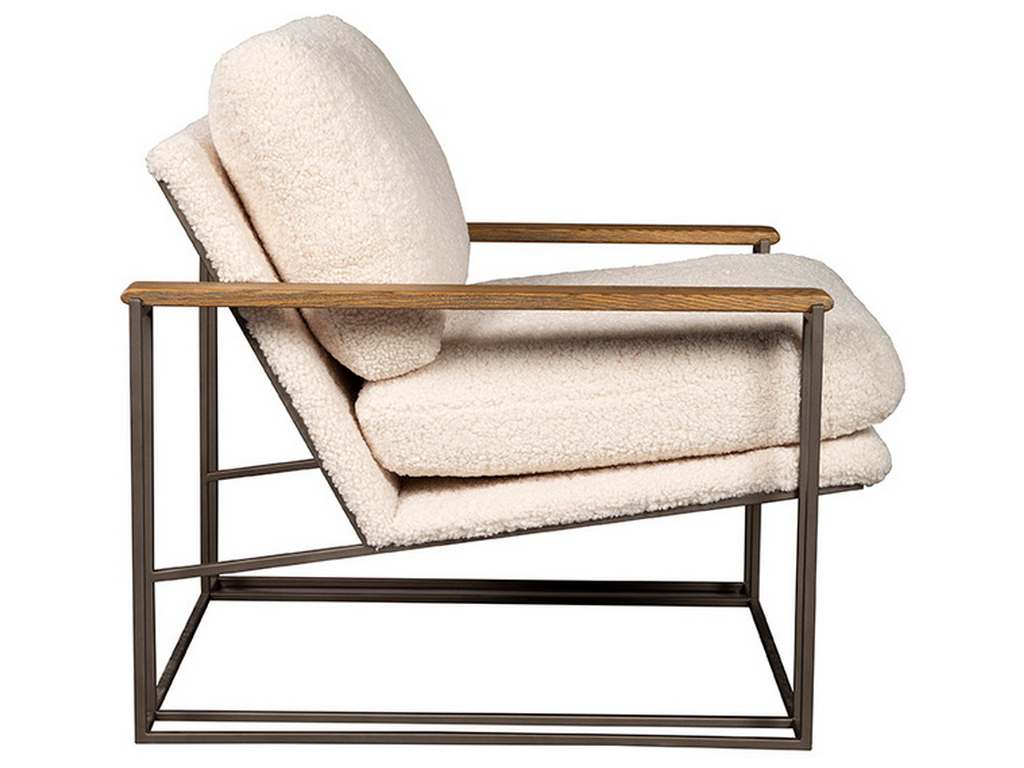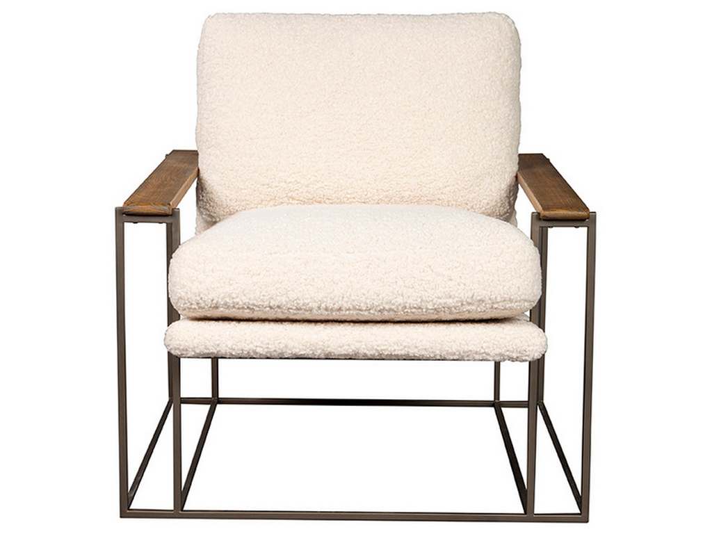 Product Description: Furniture Classics 50-03 Roeder Arm Chair - Stripped to the bare essentials necessary for comfortable seating, this handsome cubist chair features a linear metal frame with oak arm rests. The seat and back are pitched for long periods of comfortable seating, and support plush seat and back cushions. The whole is upholstered in a tactilely delightful performance boucle fabric.