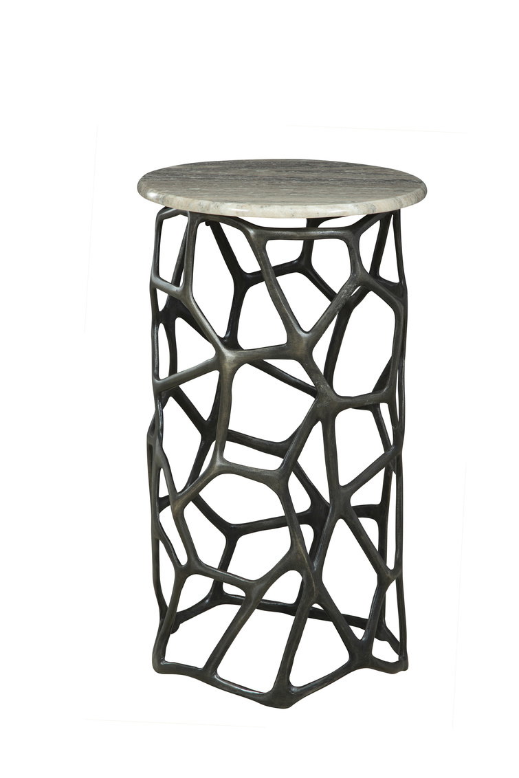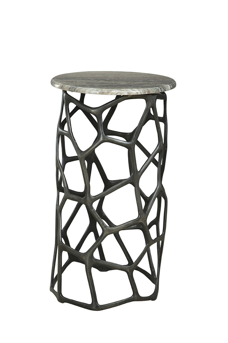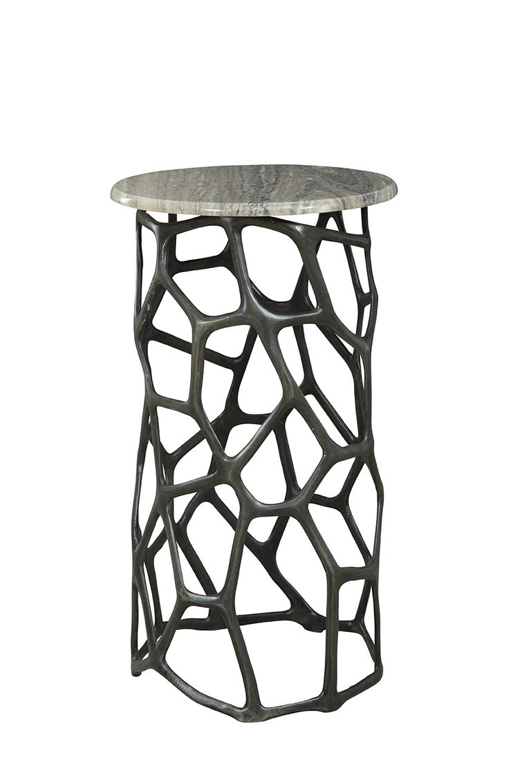 Product Description: Furniture Classics 60-103 Tall Sebastian End Table - Introducing the Tall Sebastian End Table, a contemporary marvel that seamlessly combines artistry and functionality. With an asymmetrical cast aluminum base finished in a deep grey hue, this end table radiates a sculptural quality that enhances any space. Its minimalist tan grey circular marble top directs attention to the striking base, making it a standout feature in any modern setting seeking a touch of flair.