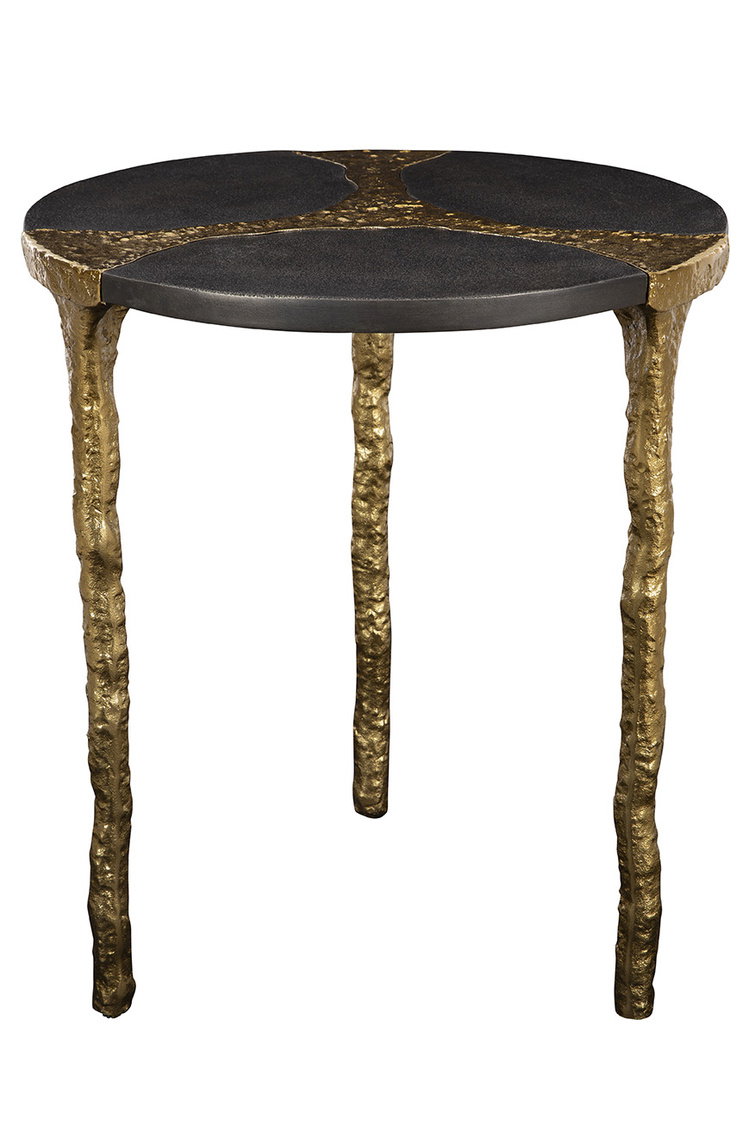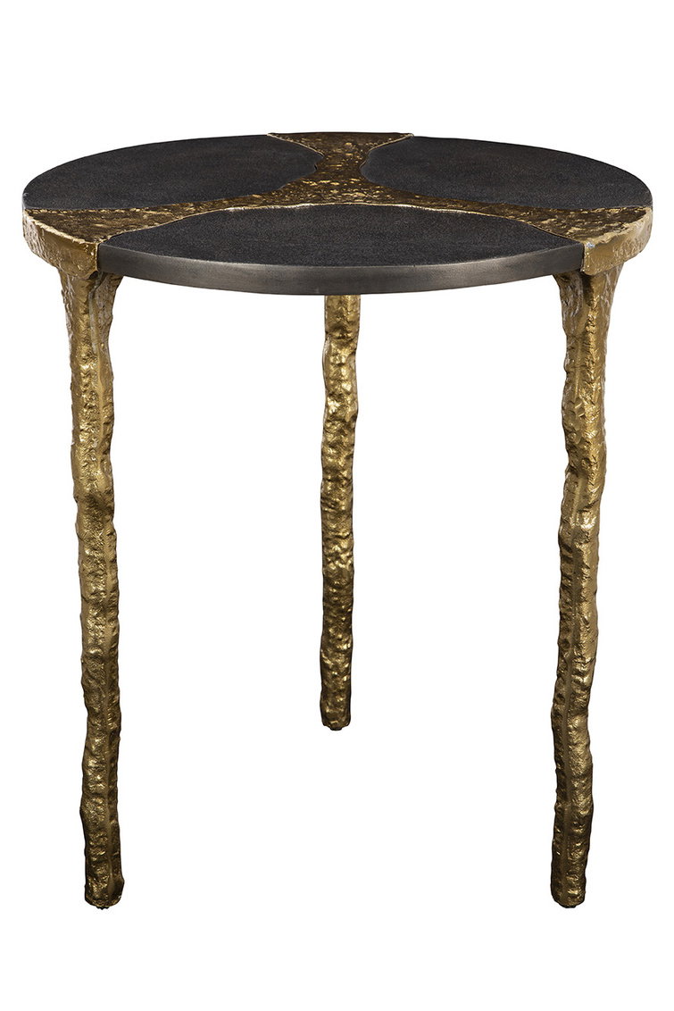 Product Description: Furniture Classics 60-59 Thompson End Table - Introducing the Thompson End Table, a small yet artful addition to your living space. The table features shimmering gold metal cascading from the center into the legs that support the tabletop. The natural gold finish lends an elegant and organic touch, beautifully complementing the black stone tabletop. Elevate your decor with the unique and sophisticated design of the Thompson End Table, blending luxurious aesthetics with natural elements for a striking visual impact.