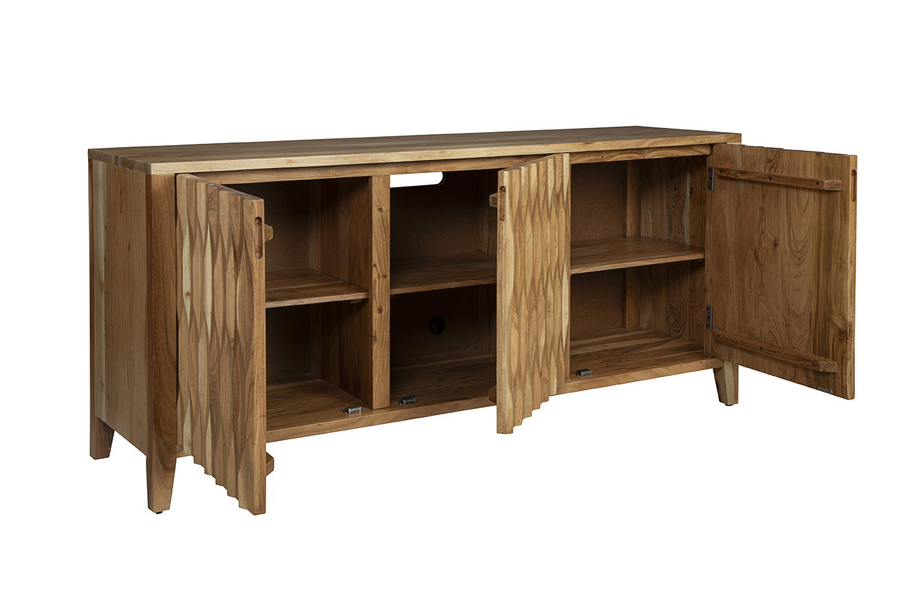 Product Description: Furniture Classics 60-76 Wintergreen Sideboard - Introducing the Wintergreen Sideboard, a modern marvel crafted from solid wood with a light natural brown finish. Versatile enough to complement various interior styles, this sideboard exudes a contemporary vibe. Featuring three cabinet doors almost disguised by the rippled wood texture, the Wintergreen Sideboard opens to reveal separate storage compartments, providing a total of six storage cubes. Ideal for those seeking simple and organized hidden storage, this piece offers both style and functionality for neatly stowing away items while maintaining a sleek look in your space.