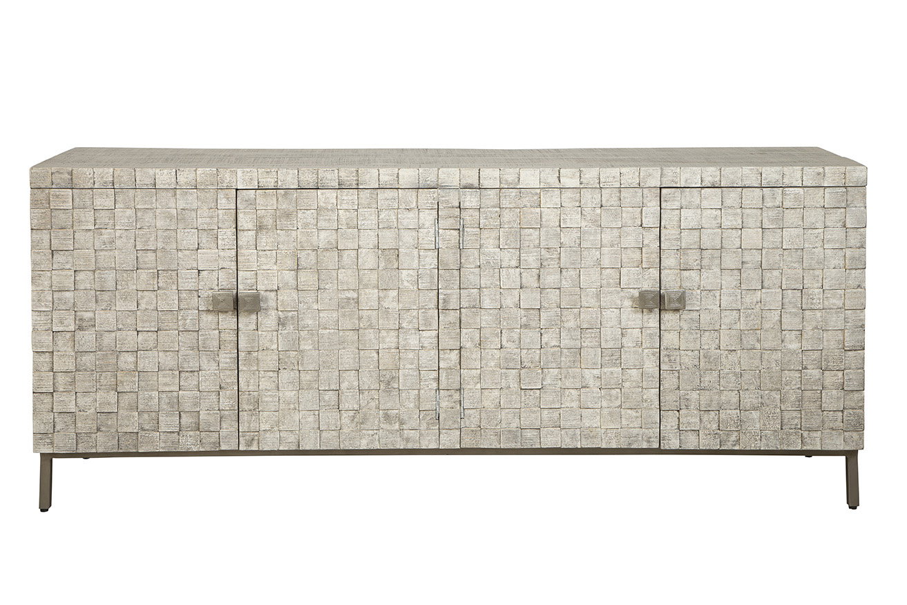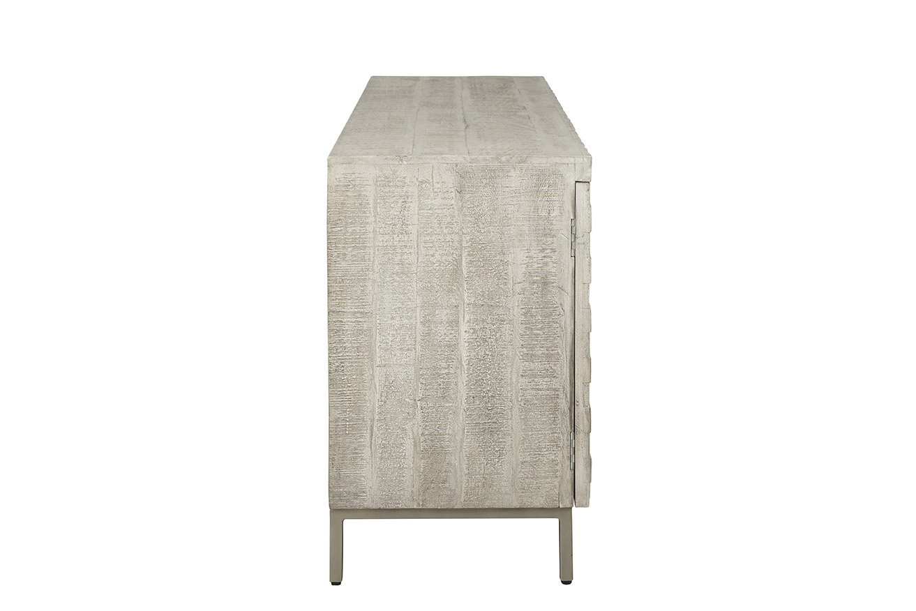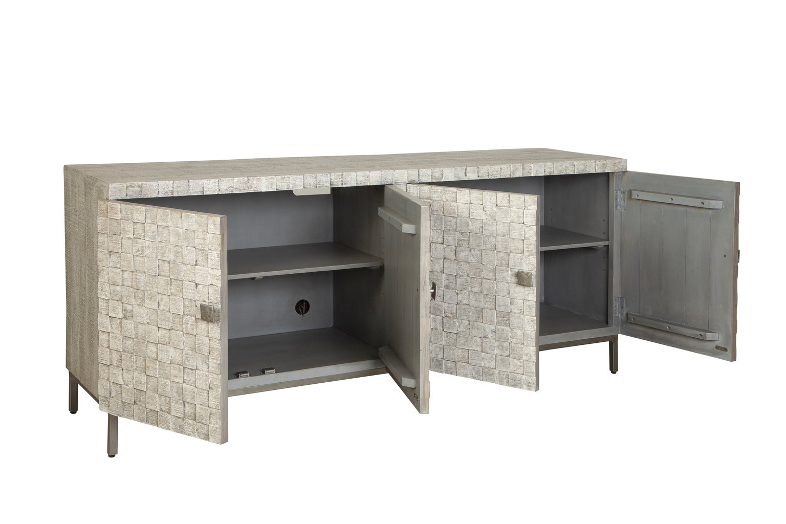 Product Description: Furniture Classics 60-79 Tritan Sideboard - Meet the Tritan Sideboard, a standout in design that's sure to be a favorite. It's crafted from heavy reclaimed hardwood, with intricae hand-carved doors featuring a 3-D basket weave design. The light white wash finish brings out all the natural wood details. Pop open the butterfly doors to reveal a roomy cabinet with shelves, giving you plenty of storage options. This piece will totally jazz up any room you put it in.