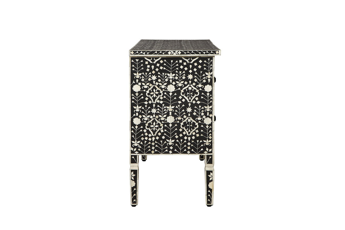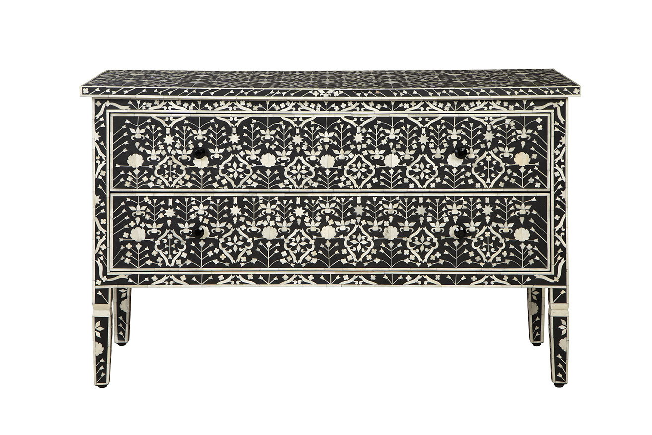 Product Description: Furniture Classics 60-98 Mogli Chest - Introducing the Mogli Chest, a stunning furniture piece featuring a black base adorned with exquisite shell and bone inlay. This ancient technique, dating back to the days of ancient Egypt, brings a luxurious touch to the chest that enhances any space. With two spacious drawers, the Mogli Chest provides both functionality and elegance, making it a perfect and unique addition to a bedroom or guest room.