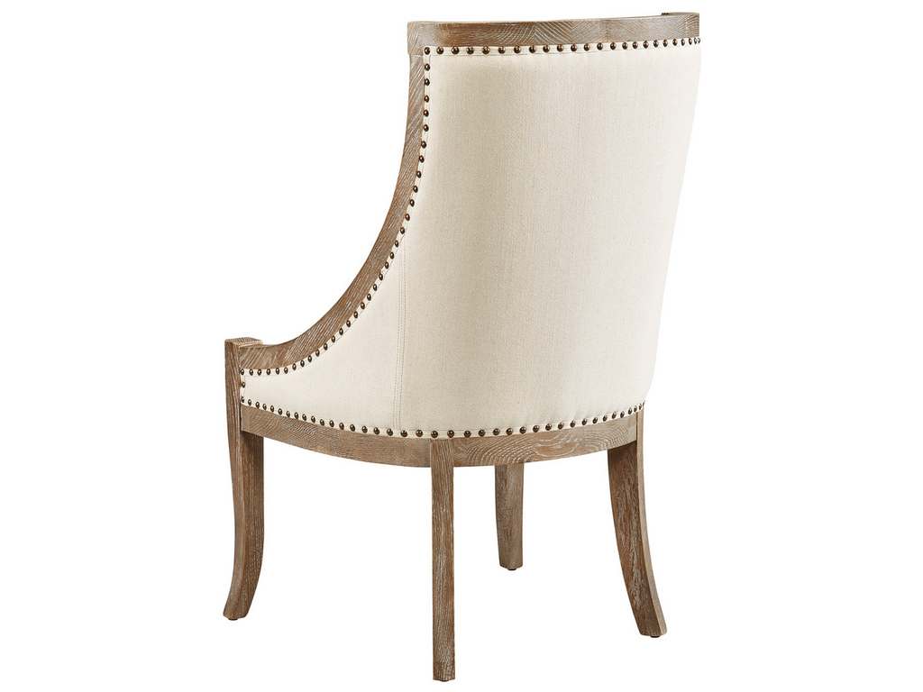 Product Description: Furniture Classics 70947LN Linen Scoop Chair - Sleekly elegant, the sweeping lines of this oak chair with a soft driftwood finish have been enhanced by the application of a simple linen fabric. Hand applied brass nail heads add visual interest to the outside back of this handsome chair. Perfect for dining and equally at home as an accent chair.