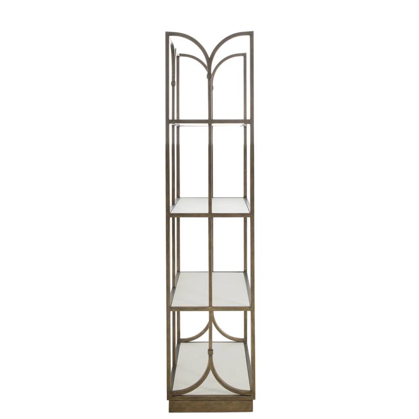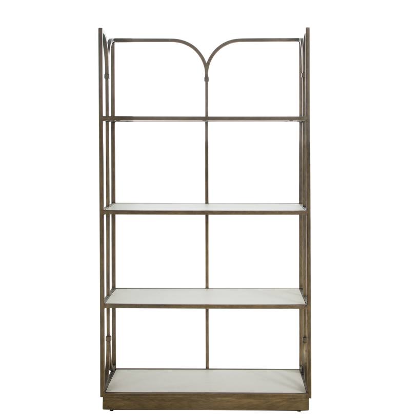 Product Description: Gabby Home SCH-175410 Belinda Bookcase - The Belinda Bookcase combines elegance with functionality. This bookcase features a sleek and arched metal frame, giving a nod to art deco designs, with wooden shelving in a sophisticated cerused white finish, emphasizing style and durability. It offers four fixed shelves, providing generous space for displaying books, decor, and other essentials. The unique design, with its graceful curves and clean lines, adds a touch of refinement to any room.
