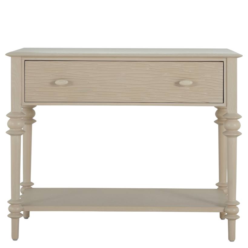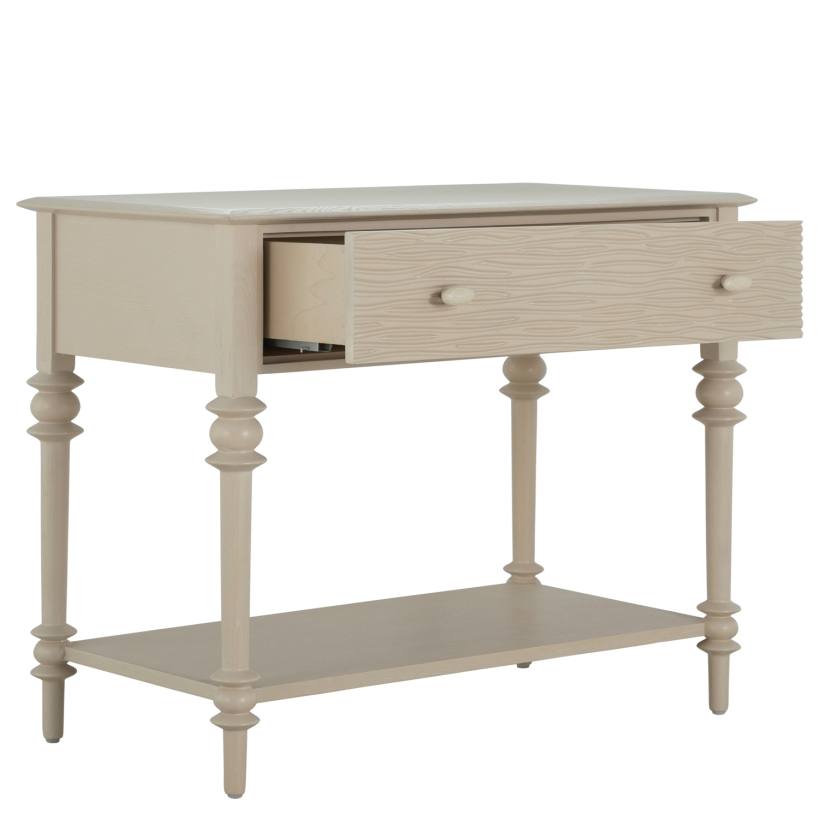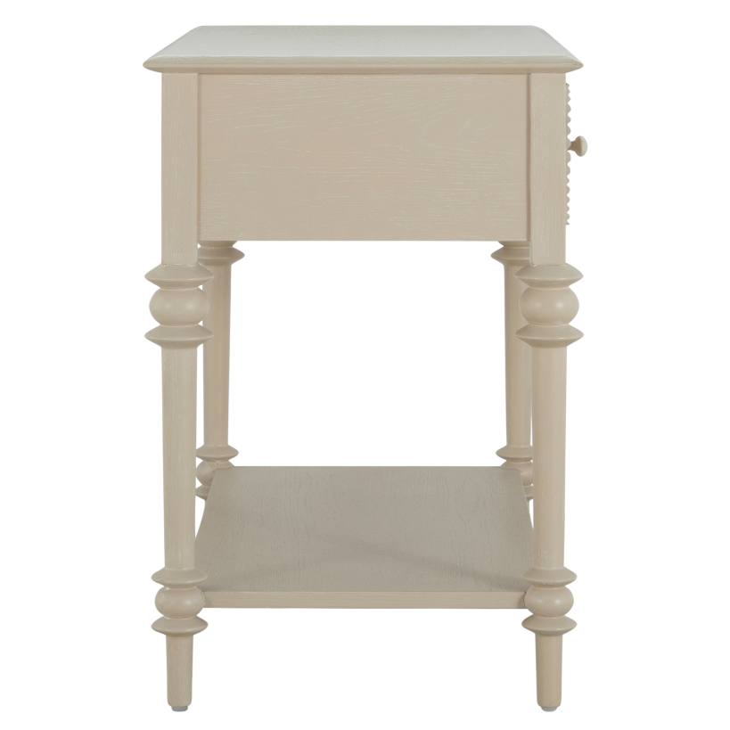 Product Description: Gabby Home SCH-175444 Anastasia Nightstand - The Anastasia Nightstand is a charming and elegant piece designed to bring a touch of sophistication to your bedside. Crafted from ash and oak veneer, this nightstand features a beautiful ceruse white finish that enhances the natural grain of the wood, giving it a textured and refined look. The nightstand has a spacious drawer with a subtle wave pattern, providing storage for bedside essentials. The drawer is complemented by stylish, rounded knobs that add a touch of classic charm. Below the drawer, an open shelf offers additional storage space for books, decor, or other items you want to keep within easy reach. The Anastasia Nightstand stands on beautifully turned legs, which add a hint of traditional elegance to its overall design.