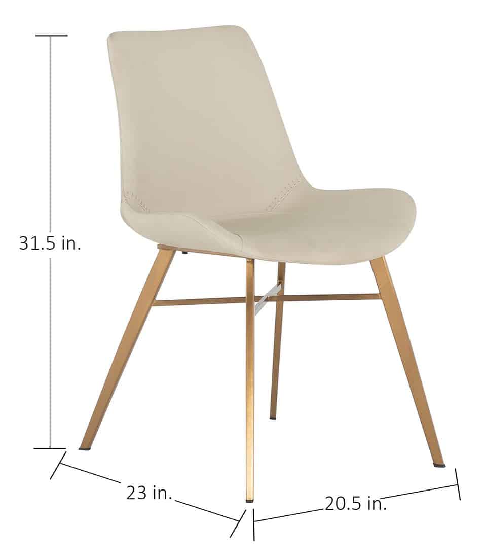 Product Description: Gabby Home SCH-175623 Hines Faux Leather Stainless Steel Dining Chair - White Gold - The Hines 18" Dining Chair combines style and comfort, making it a great choice for any dining area. Upholstered in white faux leather, it delivers a luxurious, low-maintenance look, while the iron legs in a stainless gold finish add a sleek, modern touch. Its ergonomic design ensures lasting comfort, ideal for extended meals and gatherings. Durable and versatile, the Hines Dining Chair complements a variety of interior styles, from contemporary to industrial chic, and is also available in a dark brown option.
