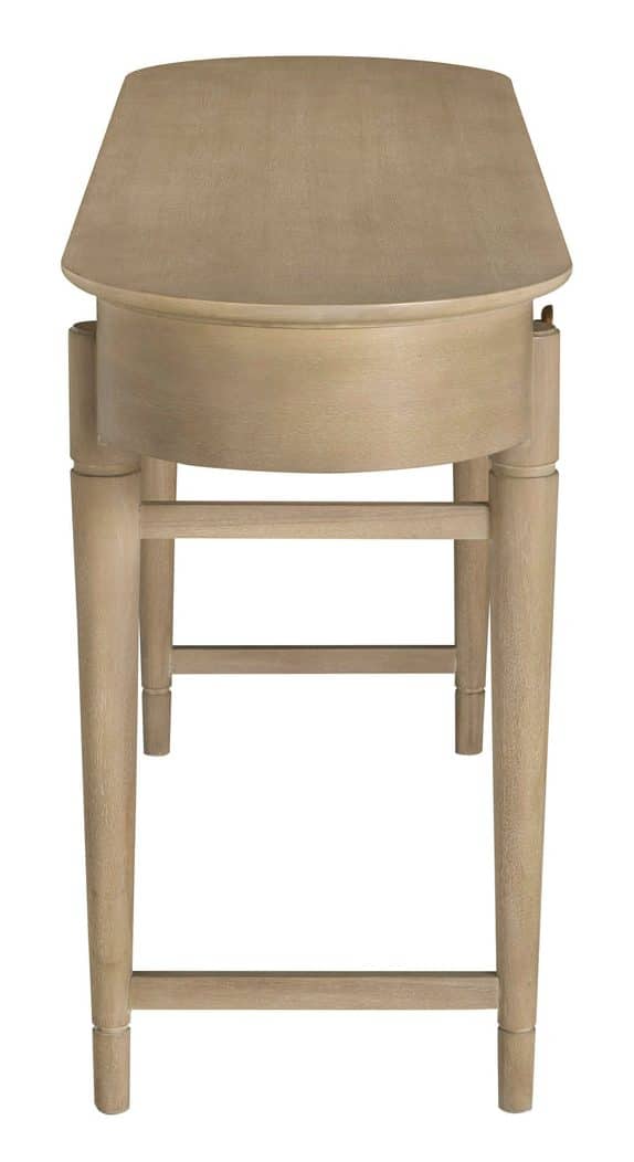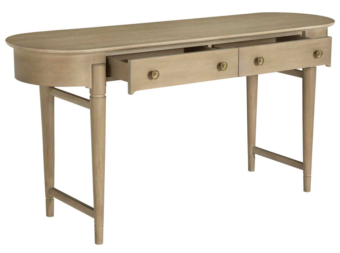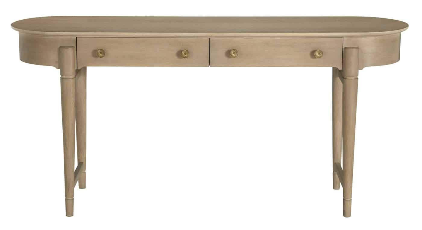 Product Description: Gabby Home SCH-175959 Rosebank Mahogany Wood Oval Trestle Console Table - The Rosebank Console combines classic elegance with meticulous craftsmanship. Crafted from mahogany in a Drift finish, it features a graceful profile with rounded corners and slender, tapered legs that add softness and sophistication. Two soft-close drawers are accented with satin brass pulls engraved with a delicate rose motif, offering a refined decorative touch. The tabletop’s ribbon-cut veneer forms a subtle radiating pattern, bringing texture and warmth to the piece. Versatile and stylish, the Rosebank Console is perfect for an entryway, behind a sofa, or as an elegant accent in a dining or bedroom space.