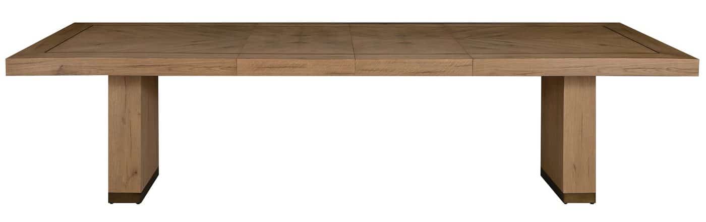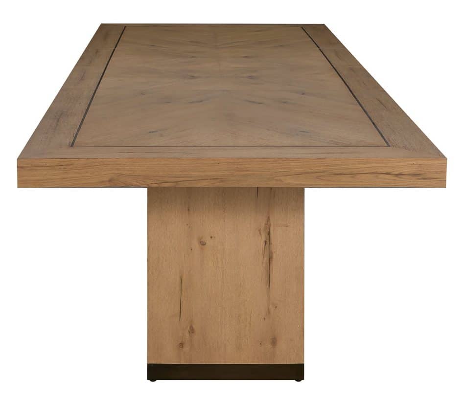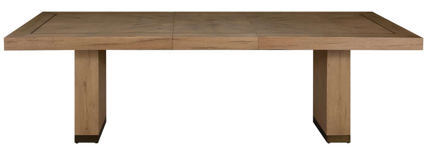 Product Description: Gabby Home SCH-175974 Highland Oak Rectangle Legged Extension Dining Table - Dawn - The Highland Extension Dining Table in Dawn exemplifies understated elegance through its thoughtful design and natural materials. Constructed from rustic oak with a soft Dawn finish, the table pairs clean, modern lines with the warmth of organic wood grain, accented by a subtle chevron-inspired inlay on the tabletop. Brushed bronze details along the edges and base add a touch of sophisticated contrast, enhancing its refined appeal. Equipped with two 20-inch extension leaves, the table expands from 78 inches to 118 inches, comfortably seating up to twelve. Versatile and timeless, the Highland Dining Table in Dawn brings effortless style to both everyday meals and formal gatherings.