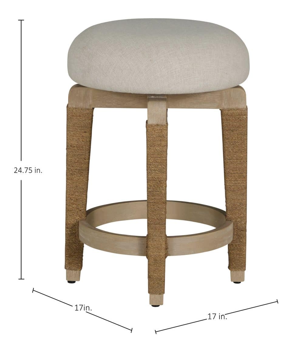 Product Description: Gabby Home SCH-176001 Maris Mahogany Counter Stool - The Maris Swivel Counter Stool embodies understated coastal elegance through its use of natural materials and clean design. Made from mahogany in a light Drift finish, the frame features sleek lines and subtle texture, while hand-wrapped banana leaf rope accents on the legs add warmth and artisanal charm. A smooth 360-degree swivel and a sturdy mahogany footrest provide comfort and functionality. The plush, round seat is upholstered in Slipaway Ivory performance fabric, a durable neutral that complements a wide range of color schemes. Ideal for kitchen counters or casual dining areas, the Maris Counter Stool combines relaxed sophistication with everyday practicality.