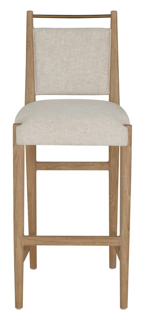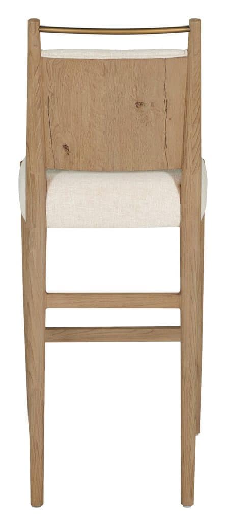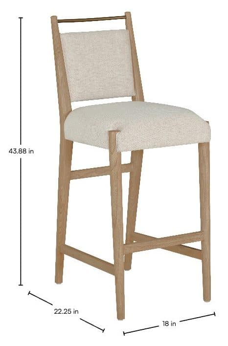 Product Description: Gabby Home SCH-176006 Highland Oak Reclined Back Bar Stool - Dawn - The Highland Bar Stool blends understated elegance with practical functionality. Made from oak, its streamlined silhouette is complemented by Slipaway Sand performance fabric, offering durability and easy maintenance. A cushioned seat and supportive back provide lasting comfort, while the brass-toned bar along the upper back adds both a stylish accent and a convenient handle for moving the stool. With clean lines and well-proportioned design, it’s a sophisticated addition to kitchen islands or bar areas, seamlessly fitting into modern, transitional, or rustic interiors.