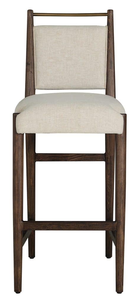 Product Description: Gabby Home SCH-176007 Highland Oak Reclined Back Bar Stool - Dusk - The Highland Bar Stool blends understated elegance with practical functionality. Made from oak, its streamlined silhouette is complemented by Slipaway Sand performance fabric, offering durability and easy maintenance. A cushioned seat and supportive back provide lasting comfort, while the brass-toned bar along the upper back adds both a stylish accent and a convenient handle for moving the stool. With clean lines and well-proportioned design, it’s a sophisticated addition to kitchen islands or bar areas, seamlessly fitting into modern, transitional, or rustic interiors.