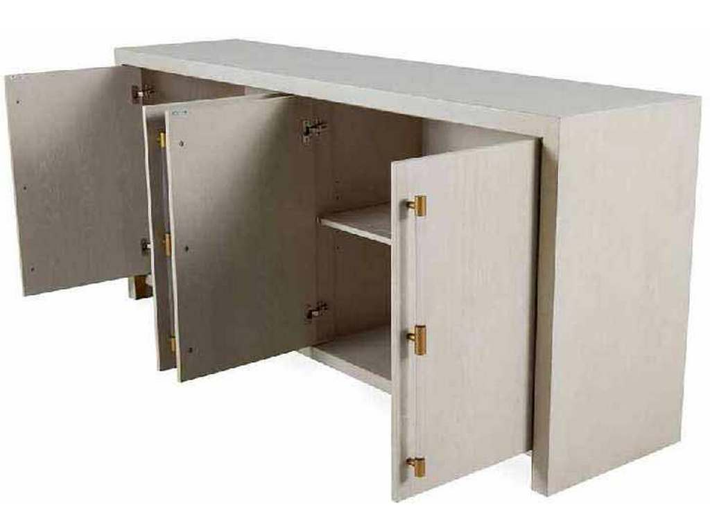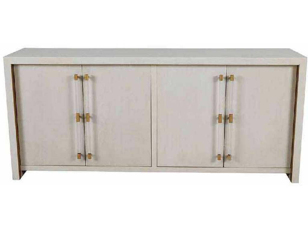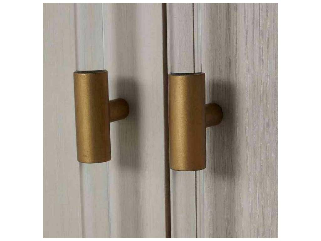 The Winford Waterfall Cabinet shows off its modern styling in a white cerused finish with gold banding highlighting the waterfall design. Cabinet doors feature contemporary acrylic handles with gold-stained metal accents.