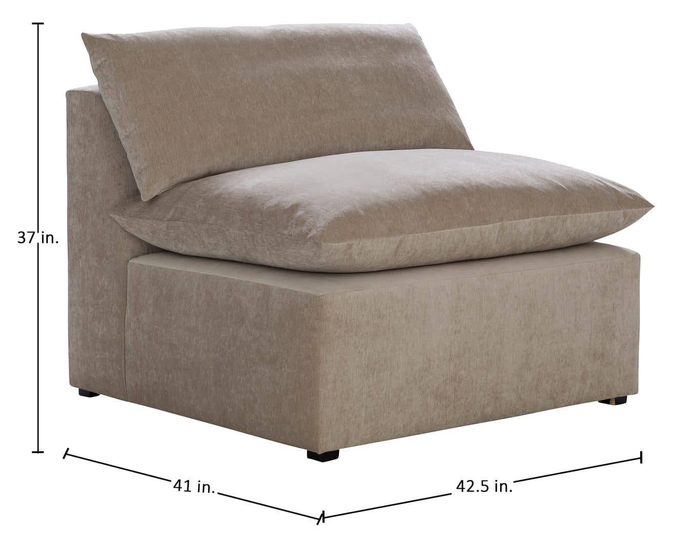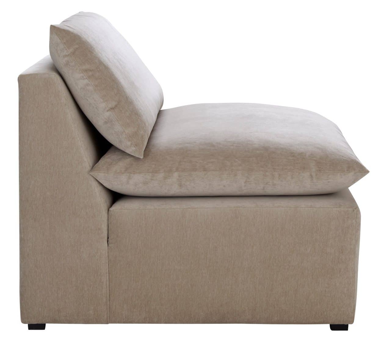 Product Description: Gabby Home SCH-5963 Carrera Bay Upholstered Sectional Armless Chair - The Carrera Bay Armless Chair brings a relaxed, contemporary feel with its streamlined, low-profile design and generously deep seat. Crafted for exceptional comfort, it showcases oversized, plush cushions that create a soft, sink-in lounging experience. The armless silhouette offers versatile placement—ideal as a standalone accent or combined with other Carrera Bay modular pieces for a customized setup. Available in a variety of fabrics, you can visit your local Gabby store to select the perfect option for your home.