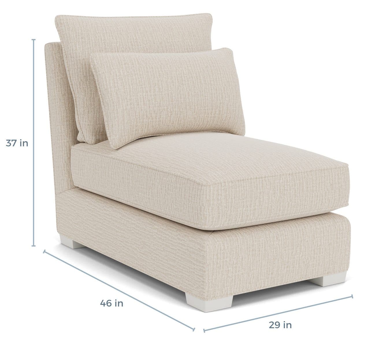 Product Description: Gabby Home SCH-774 Westley Upholstered Sectional Chair, Deep Seat - Armless - The Westley Sectional Collection reimagines the chic style and inviting comfort of the Westley Sofa in a flexible sectional layout. Showcasing graceful curves, generous deep seating, and wide, sloped arms, it delivers relaxed comfort with a sophisticated profile. Its low, deep frame enhances the lounging experience, all supported by wooden legs. Handcrafted in North Carolina, each piece reflects quality craftsmanship, offering an ideal blend of coziness and elegance for any living space.