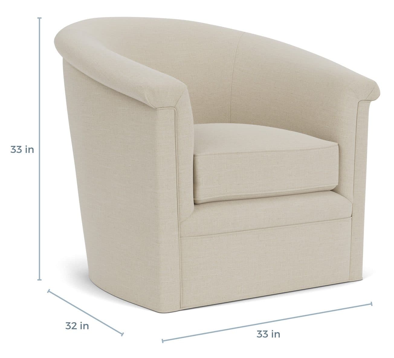 Product Description: Gabby Home SCH-843 Barclay Upholstered Swivel Chair- Rollover Arms - The Barclay Swivel Chair is a handcrafted North Carolina piece designed for cozy comfort. It features a snug seat, low rolled back with exterior welt detailing, and a contemporary sloped barrel shape. A smooth swivel function and tight, welted seat cushion combine style, comfort, and versatility.