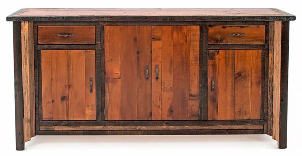 Three woods combine to create this dynamic piece. It’s appropriate for a bedroom but is also a practical addition to any rustic space needing extra storage. The posts and frames are of textured black-hued reclaimed wood. The side panels and drawer fronts are fashioned from smooth barn wood. Weathered gray corral board is used for accents. The pulls are hand-forged.