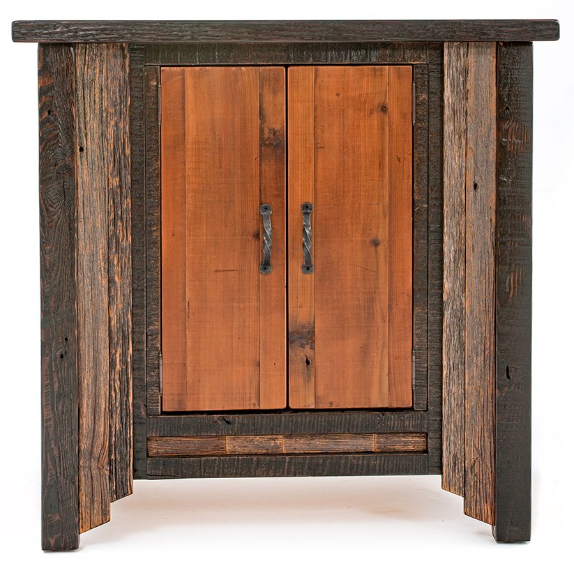 Three woods combine to create this dynamic piece. It’s appropriate for a bedroom but is also a practical addition to any rustic space needing extra storage. The posts and frames are of textured black-hued reclaimed wood. The side panels and drawer fronts are fashioned from smooth barn wood. Weathered gray corral board is used for accents. The pulls are hand-forged.