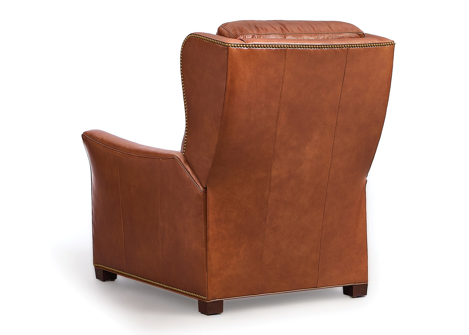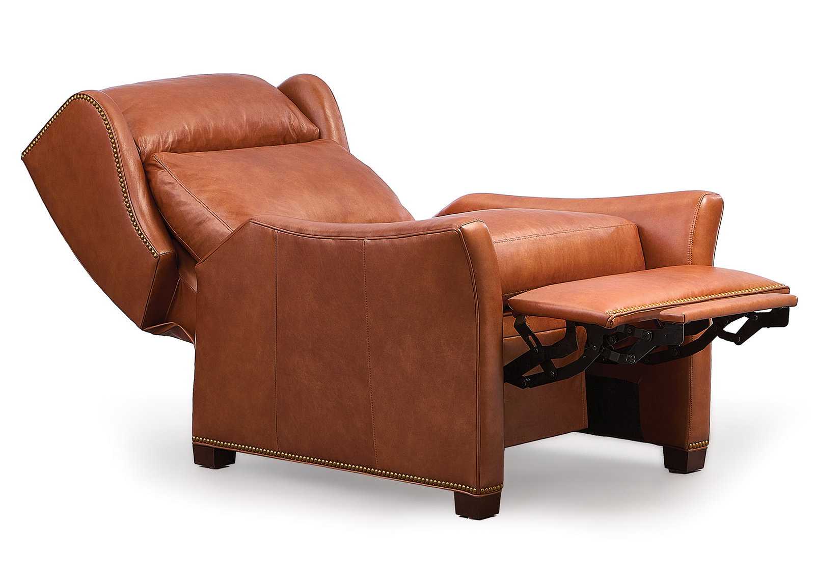 Product Description: Hancock and Moore 7223 Evander Recliner - Sculpted wing chair recliner with flared arms and bustle back. Photographed in Moseley Russet with Mahogany Distressed finish.