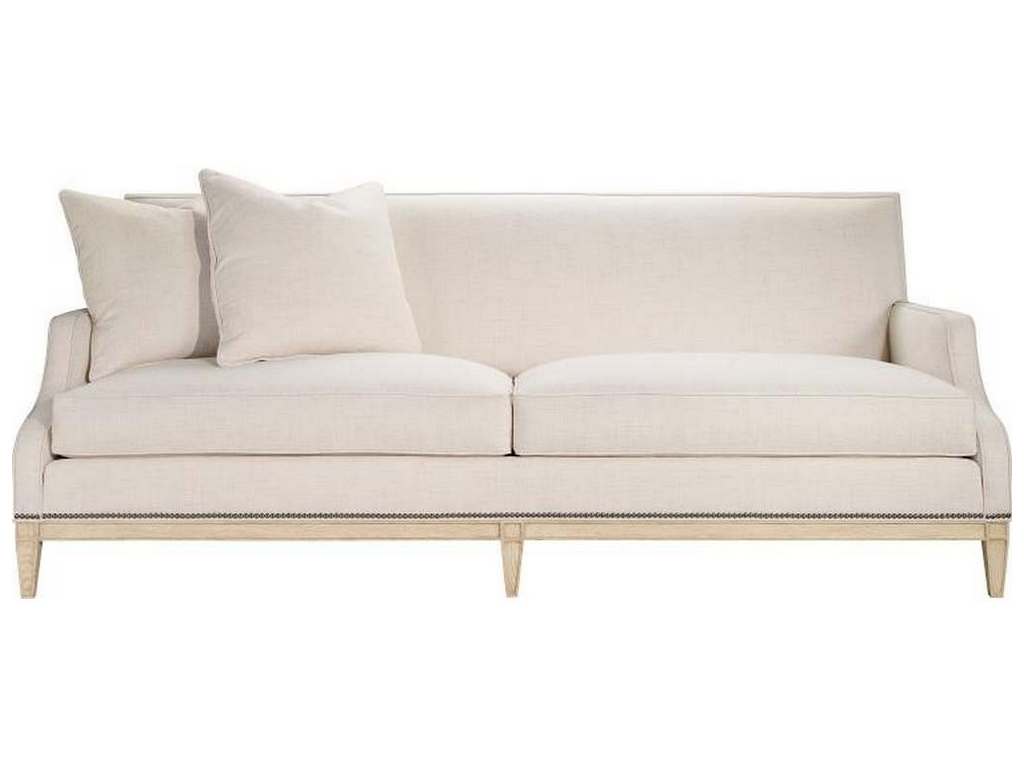Product Description: Hickory Chair HC1525-84 Monroe Sofa - The Monroe upholstery series has an Edwardian-inspired shape with French Moderne details including the wooden ash banding around the base and gracefully tapered solid ash legs. Light Walnut is the standard finish. The series includes an 84-inch sofa with two seat cushions and three front posts and a 96-inch sofa with three seat cushions and four front posts, a chair, and an ottoman. The Monroe series is standard with welt trim. Two 22-inch 100% goose feather throw pillows standard in fabric. 2-piece Luxury Spring-Down seat cushion standard.