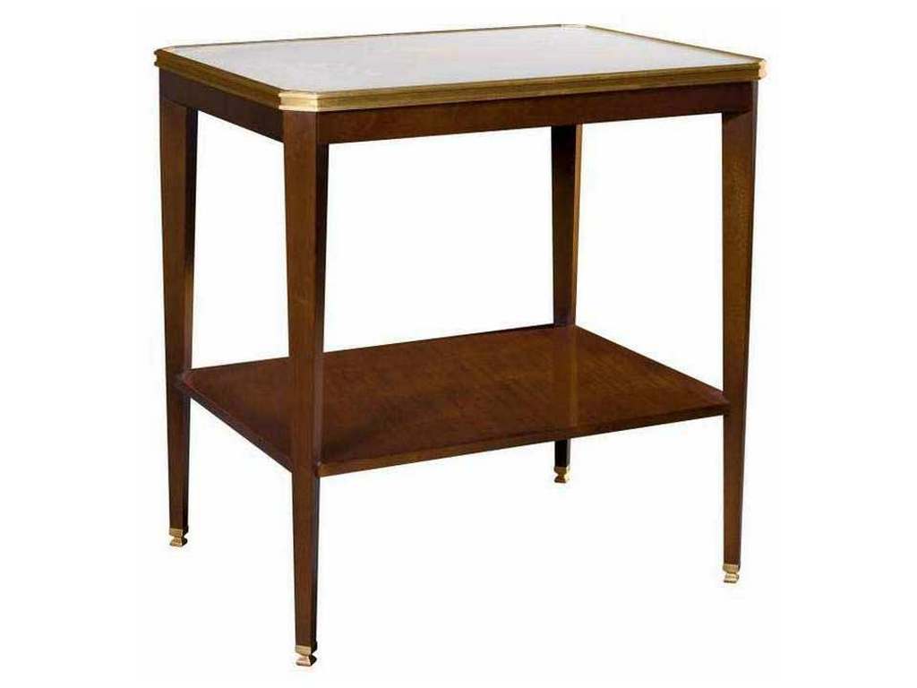Product Description: Hickory Chair HC1586-10S Suzanne Kasler Austell Side Table With Stone Top - Adapted from an antique table in Suzanne's personal collection, the Austell Side Table is crafted in richly grained mahogany solids with a choice of either white onyx stone (HC1586-10S) or an anegre wood top (HC1586-21W). The Austell Side Table features a wood shelf and a French Brass rim surrounding the top and slender tapered posts capped with matching brass ferrules. French Brass trim and ferrules standard. Light Walnut is the standard finish with White Onyx stone top.